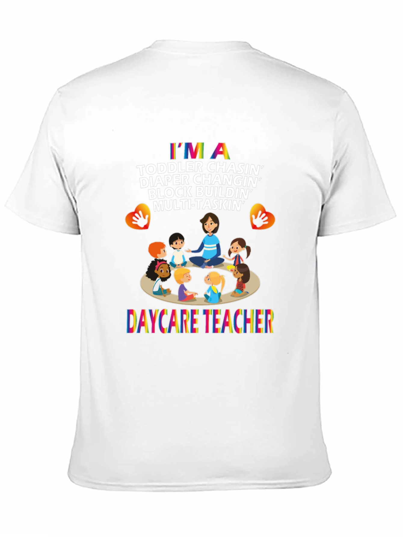 Show your passion with this 'Daycare Teacher' graphic t-shirt. Made from comfortable, breathable fabric, this tee features a colorful design with playful lettering that says, 'I'm a toddler chasin, diaper changin, block buildin, multi-taskin'.' The adorable image of a teacher surrounded by children adds a touch of sweetness. Perfect for everyday wear at work, school events, or casual outings, this t-shirt is a fun way to express your love for teaching and childcare. A unique and thoughtful gift for the special daycare teacher in your life.