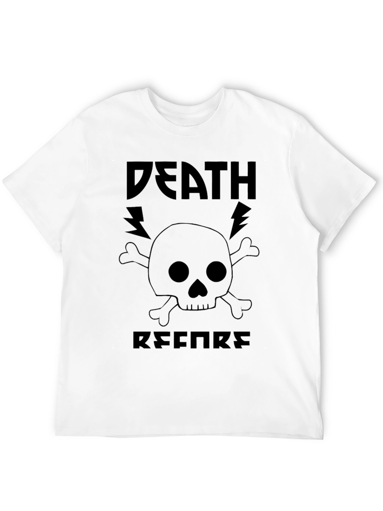 Show your edgy side with this black graphic t-shirt. The shirt features "Death Before Referee" text surrounding a skull and crossbones design, complete with lightning bolts. Made from what appears to be soft cotton, it offers both comfort and a bold statement. Perfect for casual outings, concerts, or expressing your unique personality. Pair it with jeans or shorts for a cool, effortless look. A great choice for those who appreciate alternative fashion and aren't afraid to stand out. This tee is a must-have for anyone looking to add a touch of rebellion to their wardrobe.