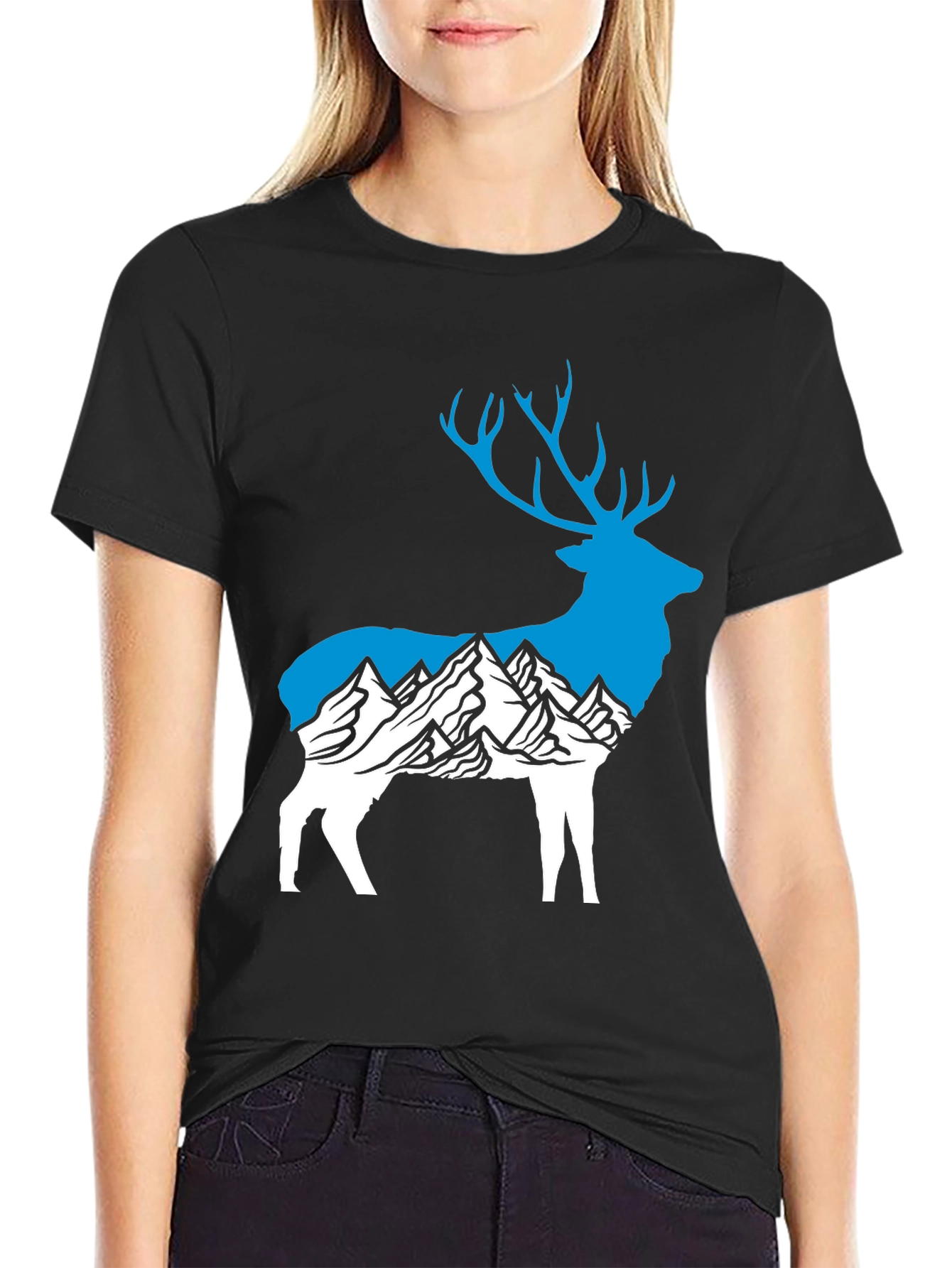 Show off your love for nature with this eye-catching black t-shirt. The unique design features a deer silhouette filled with a striking mountain range and contrasting blue accents. Made from a comfortable, breathable fabric, this tee is perfect for casual outings, hiking adventures, or everyday wear. The detailed graphic print adds a touch of wilderness to your wardrobe. This stylish and comfortable t-shirt is sure to be a conversation starter wherever you go. Get yours today and embrace the great outdoors!