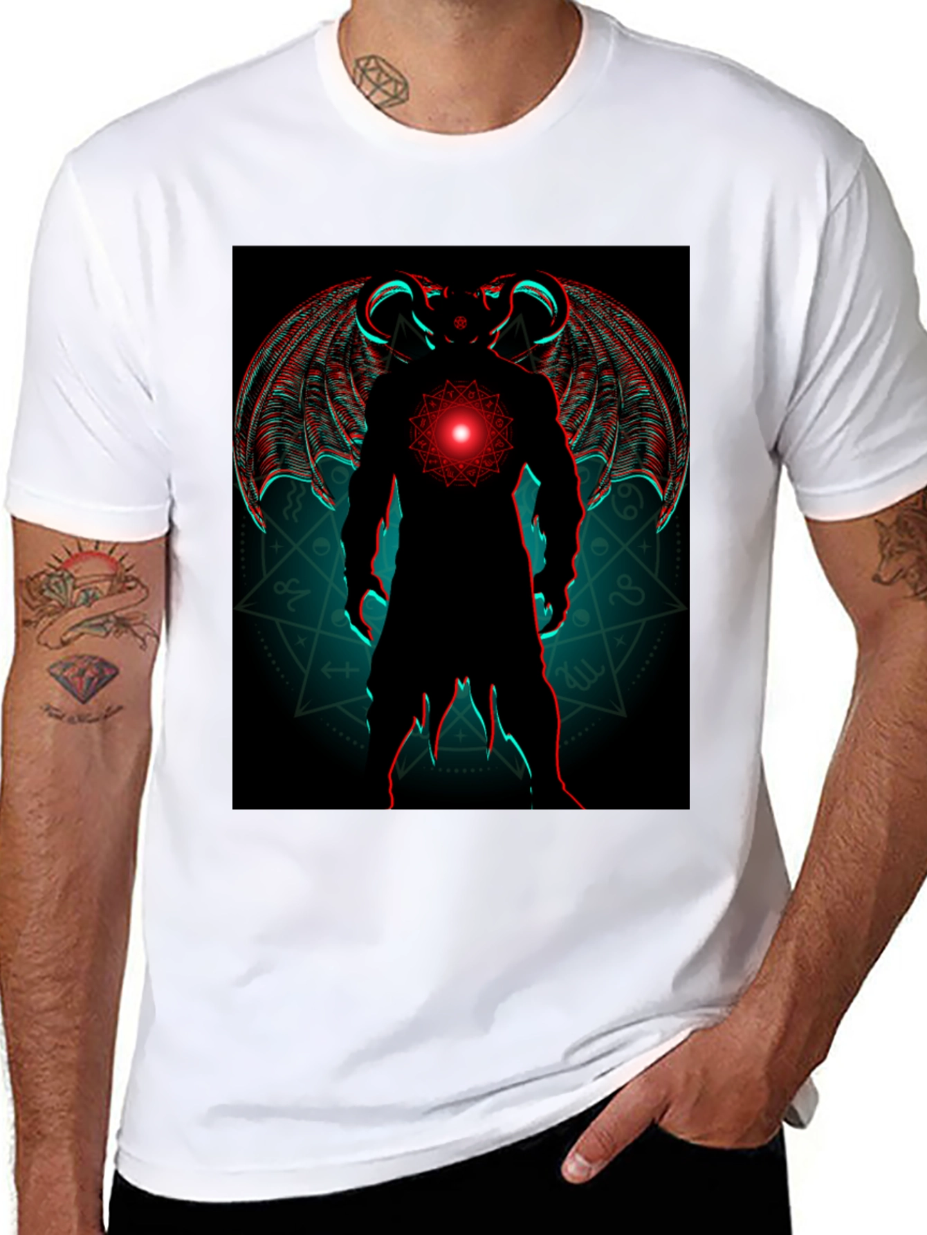 Unleash your inner darkness with this striking black t-shirt! Featuring a bold graphic of a silhouetted demon figure with intricate wings and a mesmerizing occult symbol backdrop, this tee is sure to turn heads. The vivid red and turquoise accents create a captivating contrast against the black fabric. Made from a comfortable material, this tee is perfect for casual wear, concerts, or adding an edge to your everyday style. Embrace the bold, gothic aesthetic with this unique and eye-catching t-shirt! Order yours today!