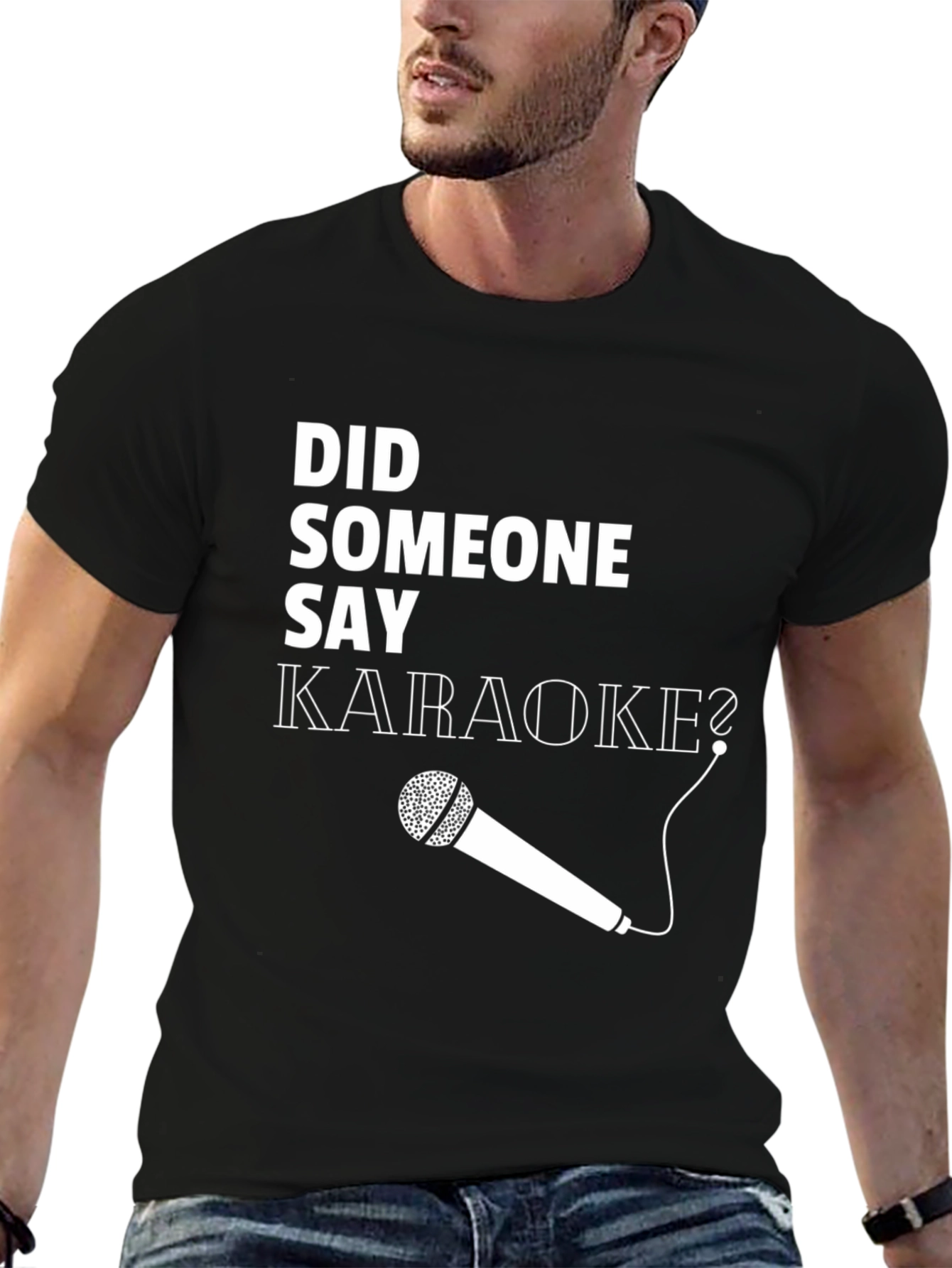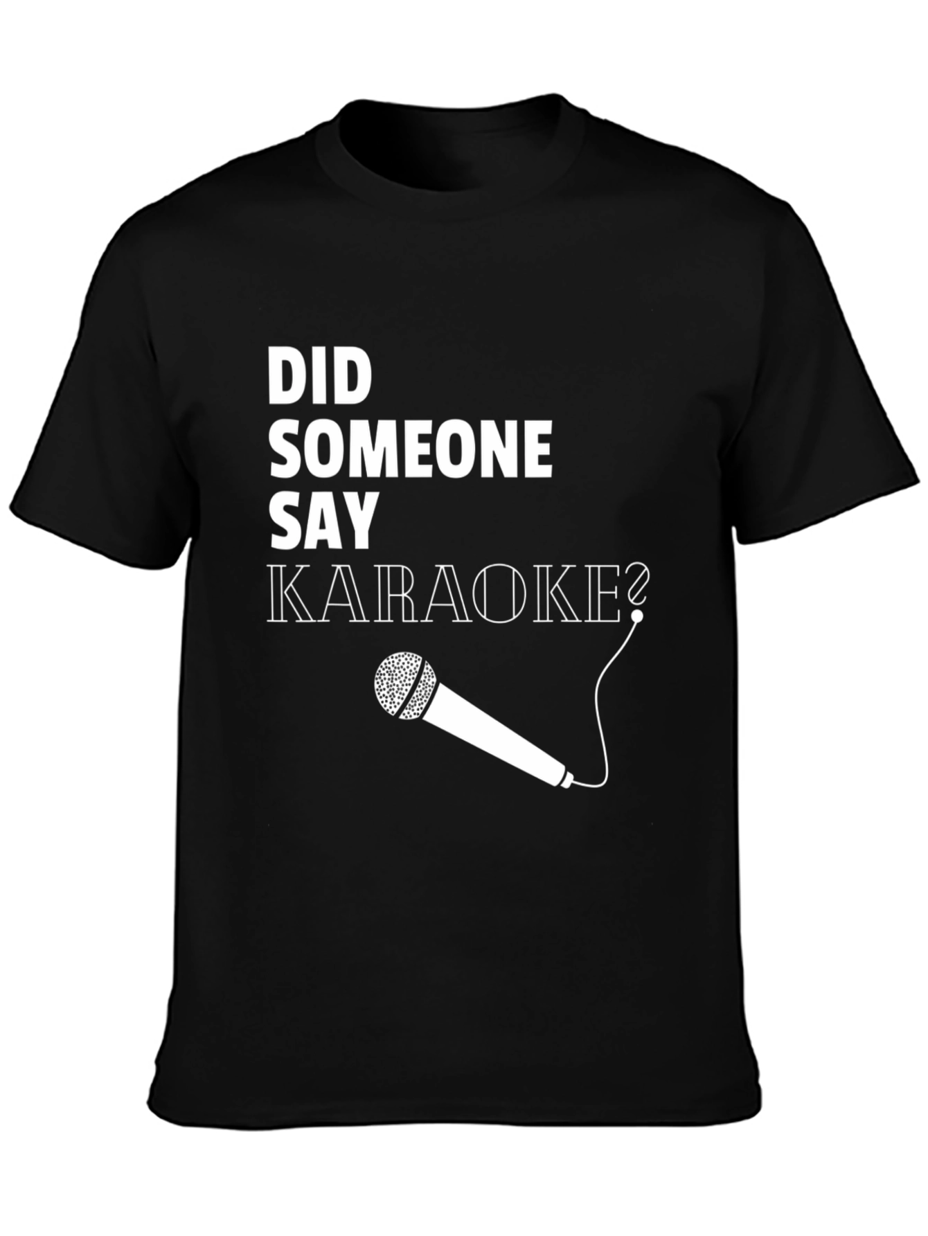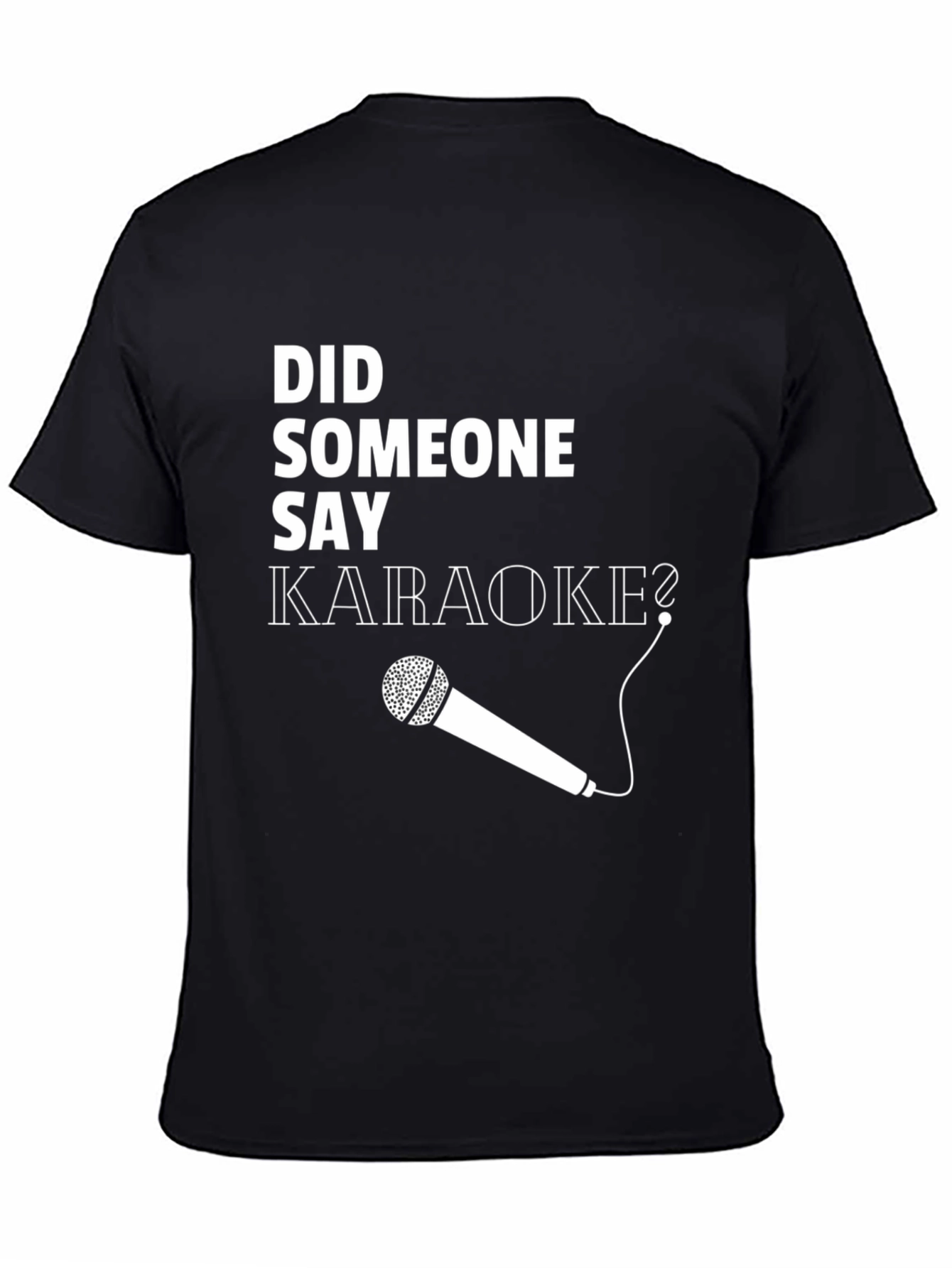 Rock the karaoke scene with this fun black t-shirt featuring a bold graphic print. The design includes the playful phrase "Did Someone Say Karaoke?" in a clean, white font, complemented by a stylized microphone illustration. Crafted from a comfortable, soft fabric, this tee is perfect for casual wear or your next singing night out. Show off your love for music and karaoke with this eye-catching tee, guaranteed to spark conversations and set the mood for a night of fun. A perfect gift for karaoke enthusiasts and music lovers!
