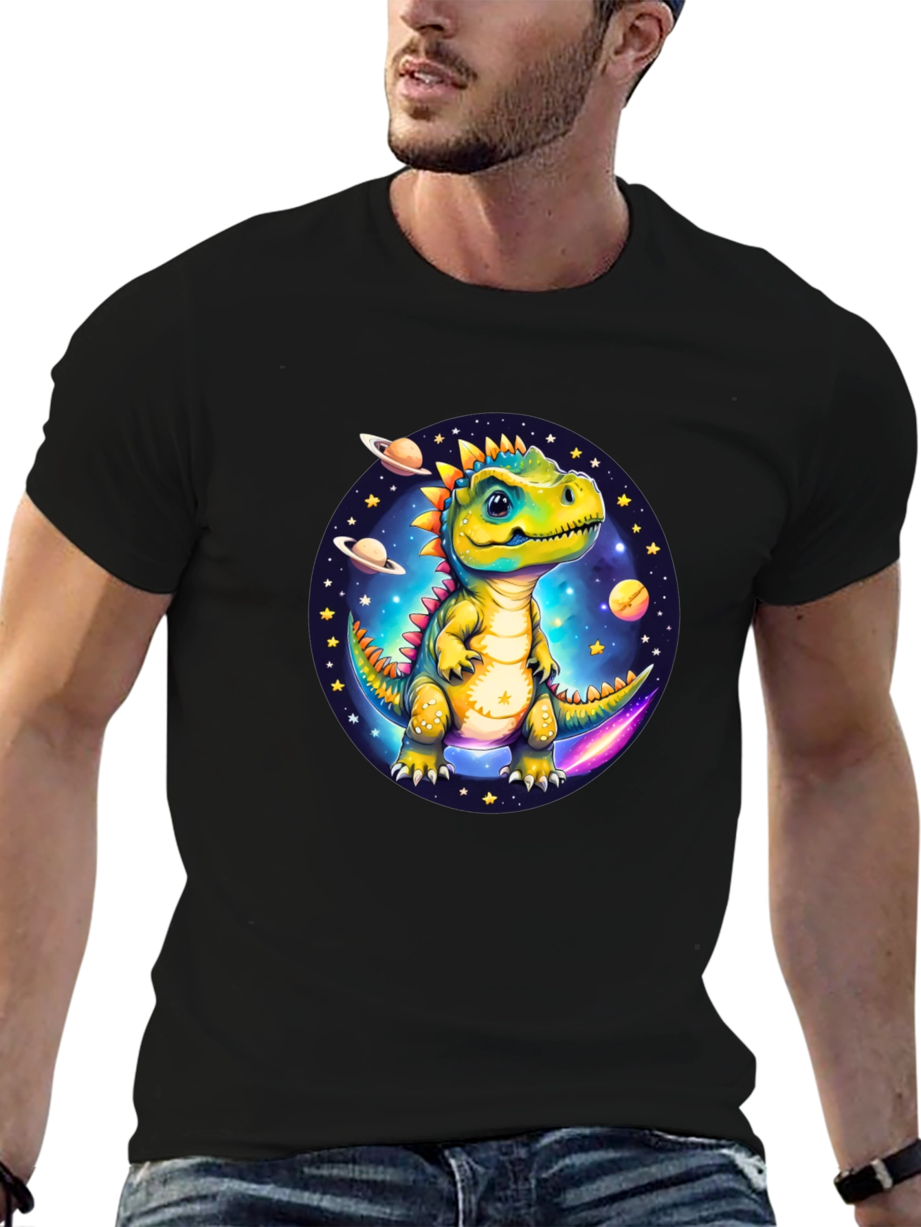 Roar into style with this unique black T-shirt featuring a vibrant cartoon dinosaur design! The playful dino is set against a galactic backdrop of stars, planets, and cosmic colors. Made from a comfortable, breathable fabric, this tee is perfect for casual wear, expressing your individuality, or a fun gift for dino and space enthusiasts. Stand out from the crowd with this eye-catching and conversation-starting design. Perfect for everyday wear, casual outings, or even themed parties. It's not just a shirt; it's a statement! Grab yours and let your style soar to new galaxies!