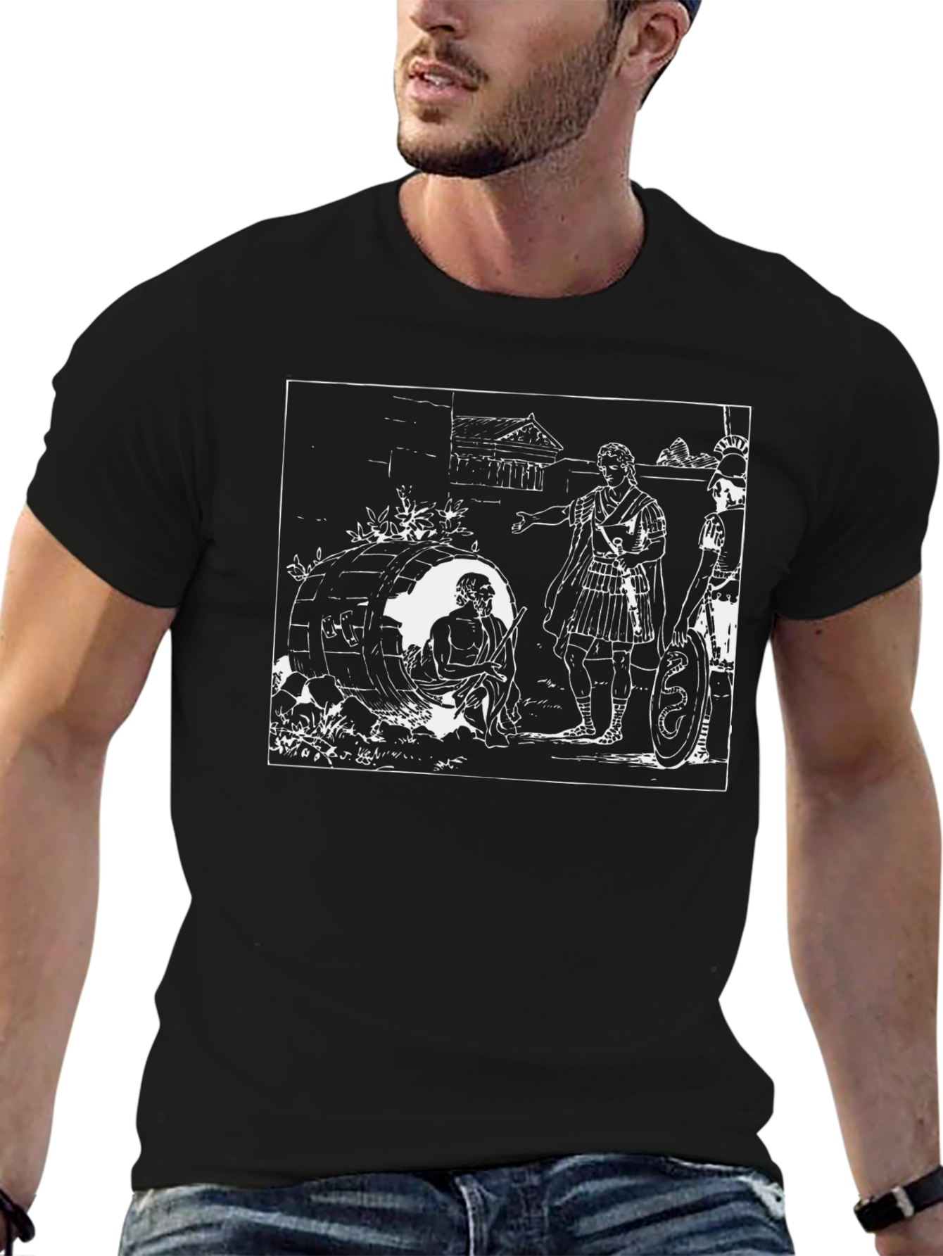 Embrace intellectual style with this unique black t-shirt featuring a striking white print of Diogenes, the famous ancient Greek philosopher. The design showcases Diogenes in his iconic barrel, with Alexander the Great visiting him. The clean, minimalist print is perfect for history buffs, philosophy enthusiasts, or anyone who appreciates classic art. Made from soft, breathable material, this tee is comfortable for everyday wear. Show off your philosophical side and spark conversations with this eye-catching tee.