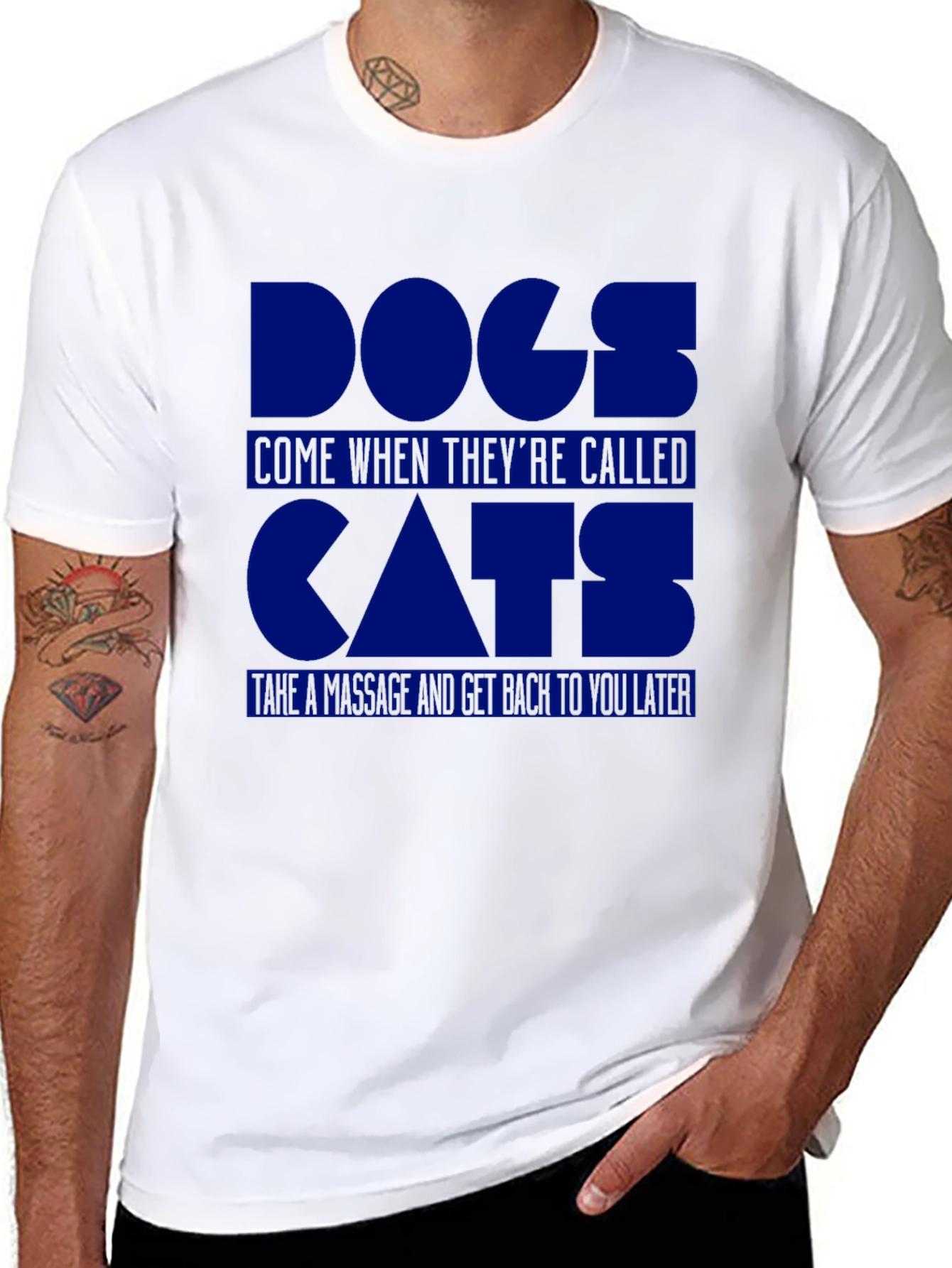 Show your love for cats with this playful graphic tee! This black t-shirt features a bold, block-letter design in blue, contrasting against the dark fabric. The text reads 'DOGS COME WHEN THEY'RE CALLED CATS TAKE A MESSAGE AND GET BACK TO YOU LATER,' a humorous nod to the independent nature of cats. Made from a comfortable-looking material, this shirt is perfect for casual wear. Ideal for cat lovers who enjoy a touch of humor in their wardrobe. This unique tee is sure to be a conversation starter. A must-have for cat owners!