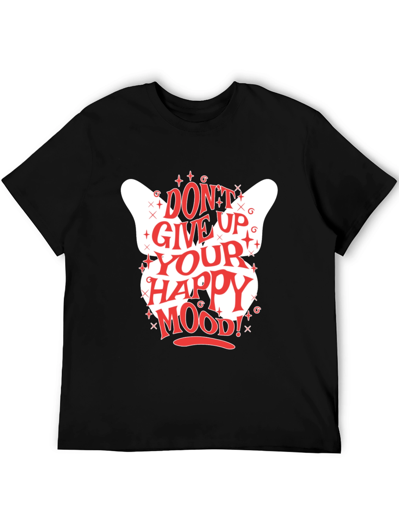 This black t-shirt features a stylish graphic print with the uplifting message "Don't Give Up Your Happy Mood!" The design is eye-catching, with a playful font. The shirt appears to be made from a soft, comfortable material, perfect for everyday wear. The classic crew neck and short sleeves make it a versatile piece that can be dressed up or down. Ideal for expressing a positive attitude, this tee is a great addition to any casual wardrobe. Wear it to school, the gym, or while hanging out with friends – spread the good vibes wherever you go!