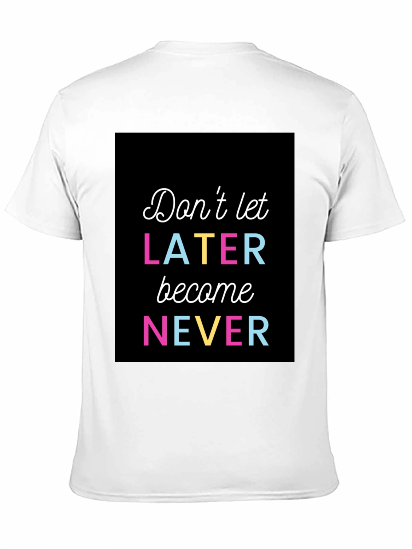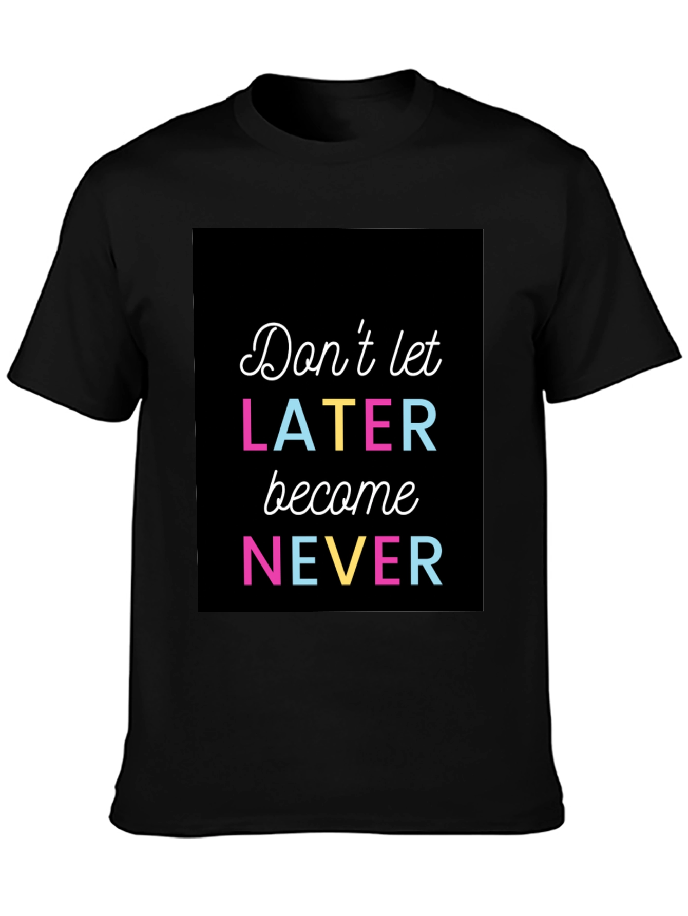 This stylish black t-shirt features a bold and colorful graphic design. The statement "Don't let LATER become NEVER" is showcased in a mix of white, pink, yellow, and blue lettering, making it a visually appealing piece. Made from what appears to be a soft and comfortable cotton blend, this tee is perfect for casual wear. Its classic fit and short sleeves make it versatile for layering or wearing on its own. This shirt is ideal for anyone looking to add a touch of inspiration and style to their wardrobe. Show off your motivation with this eye-catching t-shirt!