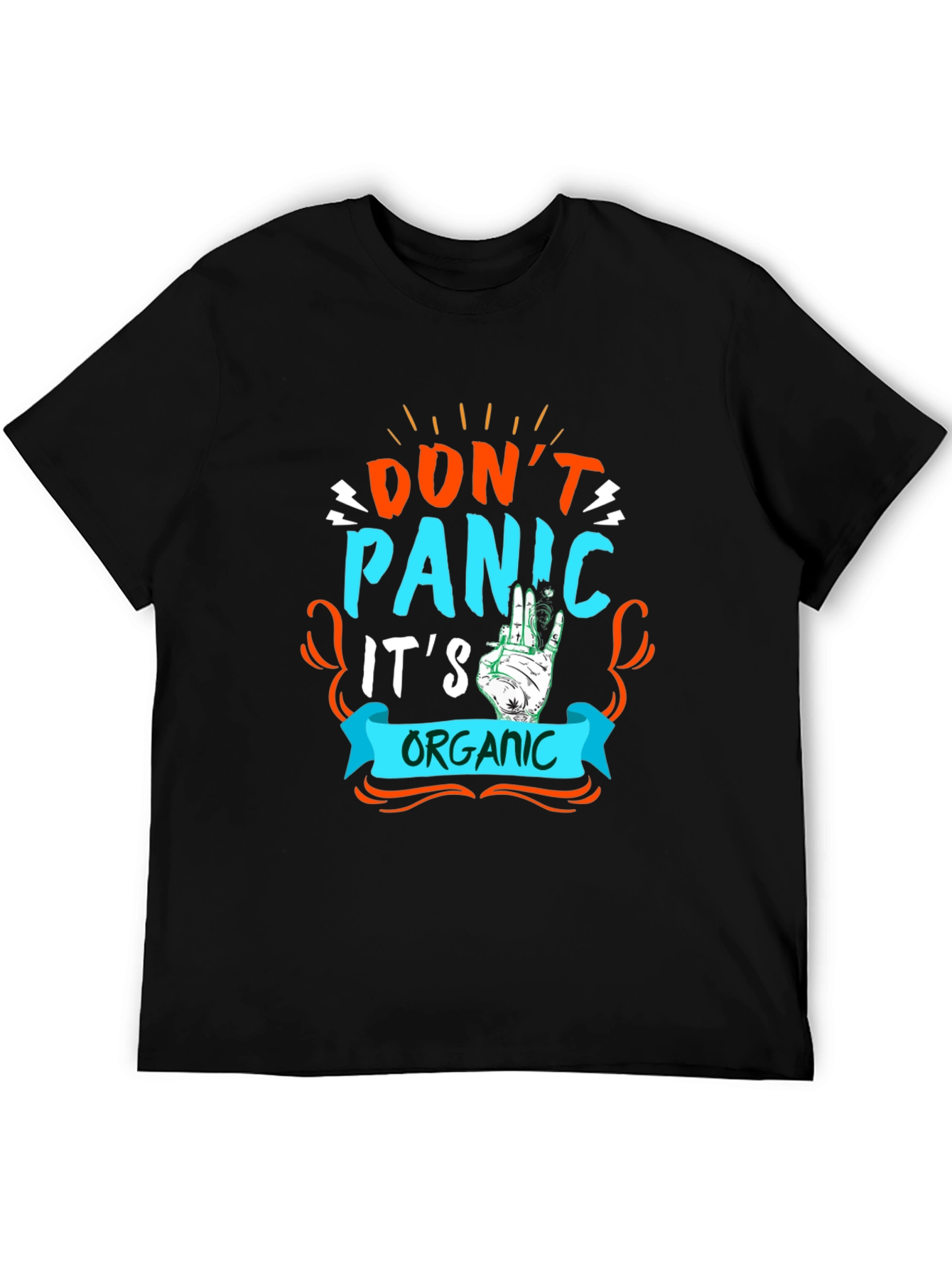 This stylish black t-shirt features a vibrant and eye-catching design. The graphic showcases the phrase "Don't Panic It's Organic" in a playful arrangement of orange and turquoise lettering. A stylized hand with a cannabis leaf adds a unique touch. The design is framed by decorative swirls and lightning bolt accents. Made from what appears to be a soft and comfortable cotton blend, this t-shirt is perfect for casual wear, expressing your personality, or making a statement. The classic fit makes it a versatile addition to any wardrobe. Show off your sense of humor and eco-consciousness with this standout tee.