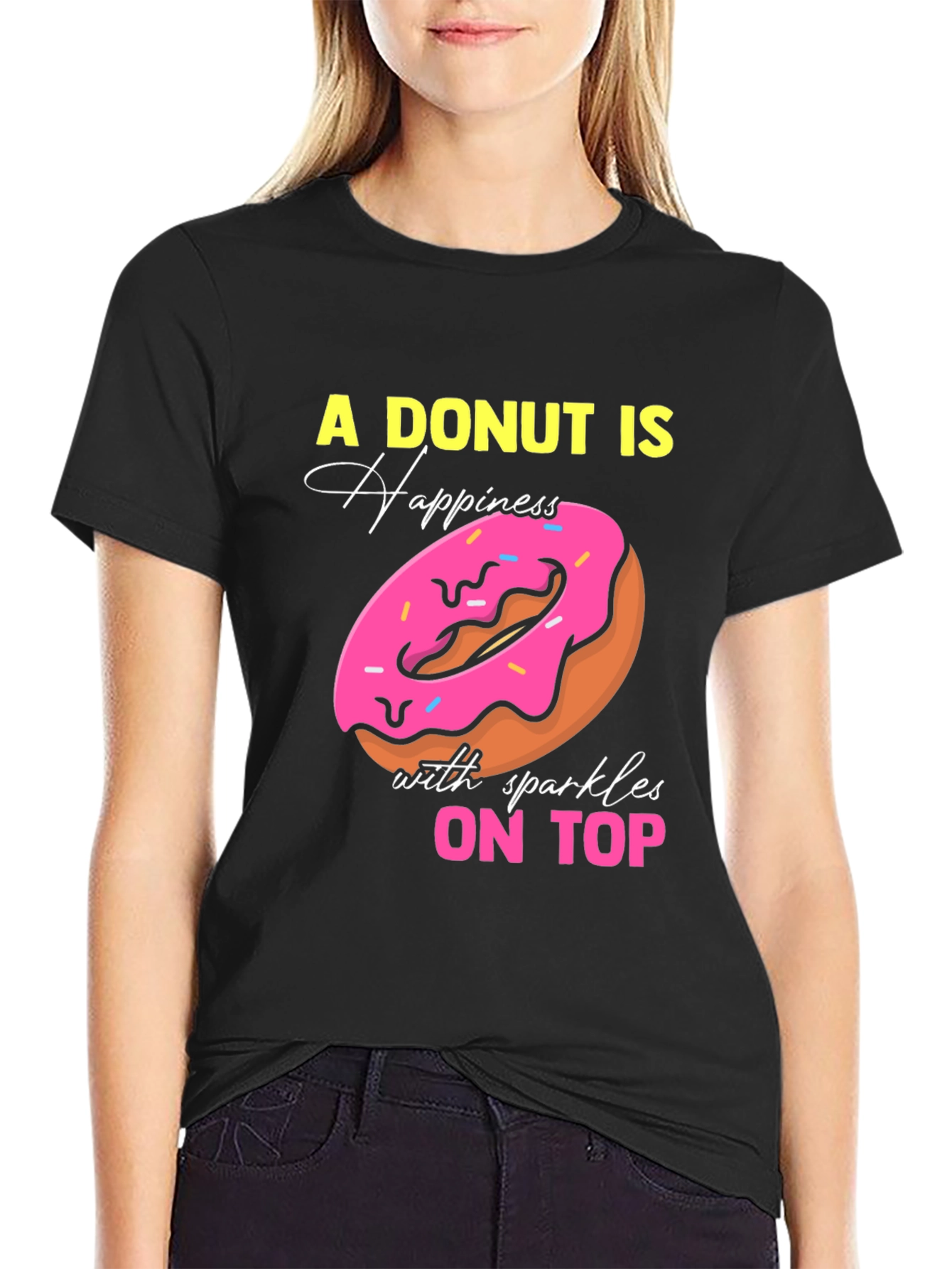 Indulge in sweetness with this fun graphic tee! Featuring a vibrant donut design with pink frosting and colorful sprinkles, this black t-shirt makes a statement. The playful text "A DONUT IS Happiness with sparkles ON TOP" adds a touch of whimsy. Crafted from a comfortable fabric blend, this shirt is perfect for casual wear and showing off your love for delicious treats. Ideal for donut enthusiasts, anyone with a sweet tooth, or as a quirky gift! Show off your fun side in this one-of-a-kind tee.