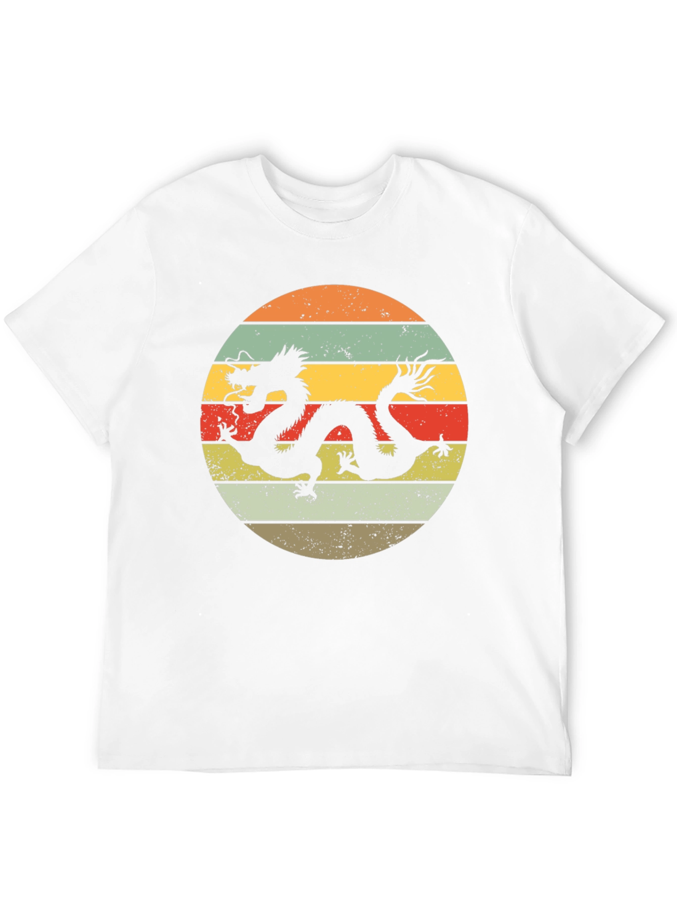 Embrace vintage vibes with this stylish black t-shirt featuring a striking dragon silhouette against a retro-striped circle backdrop. The design incorporates warm hues of orange, yellow, green, and brown, creating a visually appealing and timeless aesthetic. Made from comfortable materials, this tee is perfect for everyday wear, casual outings, or as a statement piece to showcase your unique style. The bold graphic and classic fit make it a versatile addition to any wardrobe. Whether you're a fan of mythical creatures or simply appreciate eye-catching designs, this dragon circle tee is sure to turn heads and spark conversations. Experience comfort and style combined in one must-have garment!