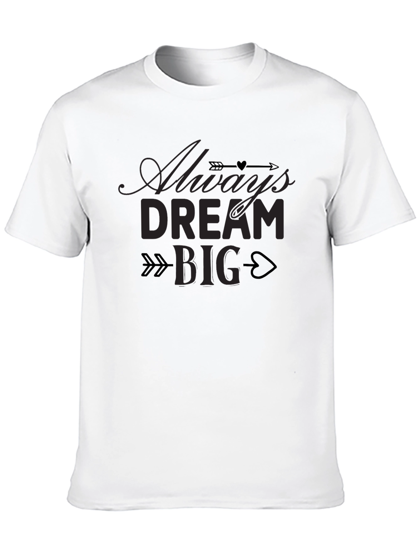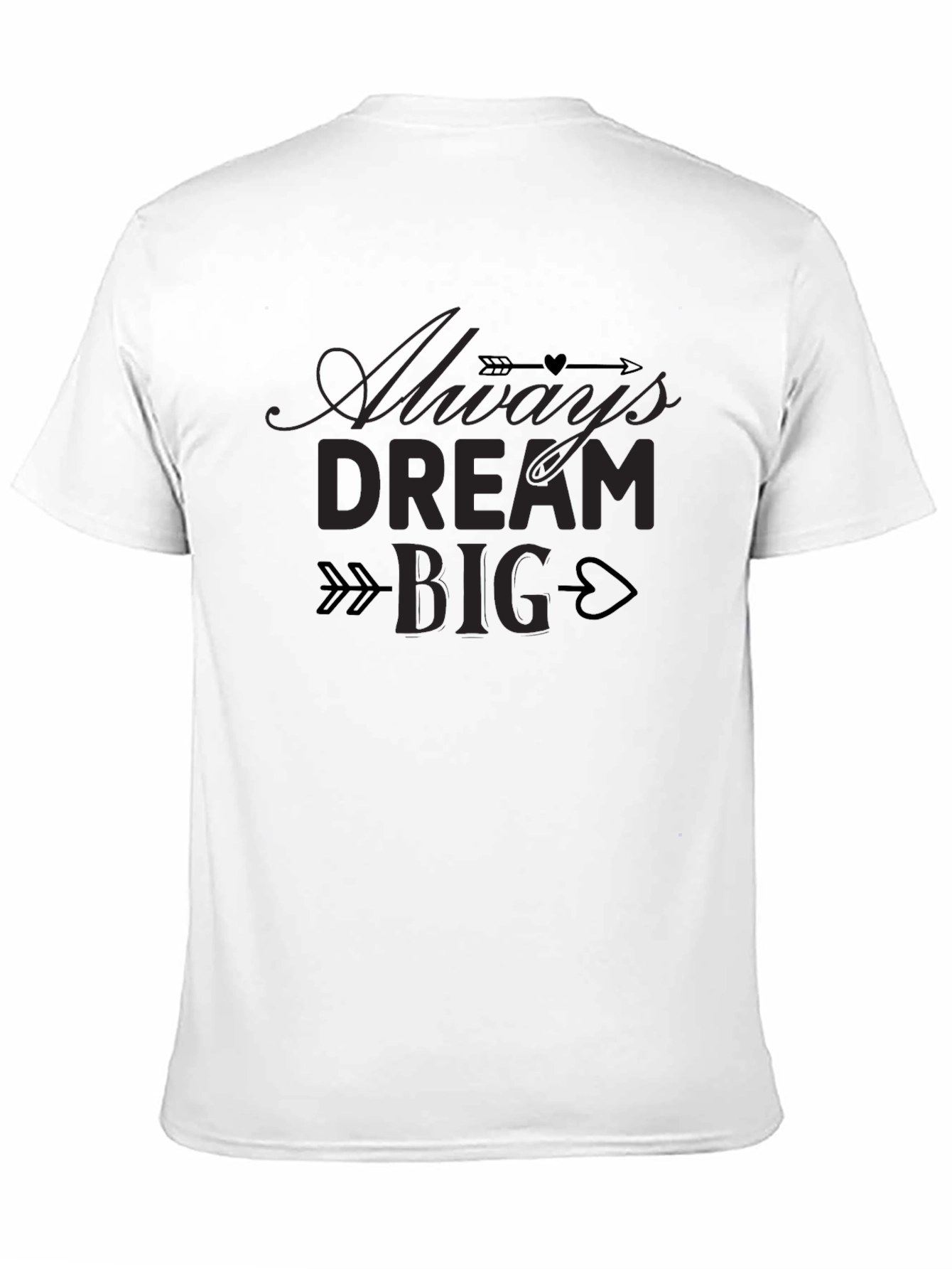 This black t-shirt features the inspiring message "Always Dream Big," creatively designed with arrow and heart accents. Made from what appears to be soft and comfortable cotton, this tee is perfect for everyday wear. The classic crew neck and short sleeves offer a relaxed fit, making it a versatile addition to any wardrobe. Showcase your positive outlook with this stylish and motivational t-shirt. Whether you're heading to the gym, hanging out with friends, or simply relaxing at home, this tee will keep you comfortable and looking great. The high-quality print ensures the design stays vibrant wash after wash. A great gift idea for anyone who needs a little inspiration!