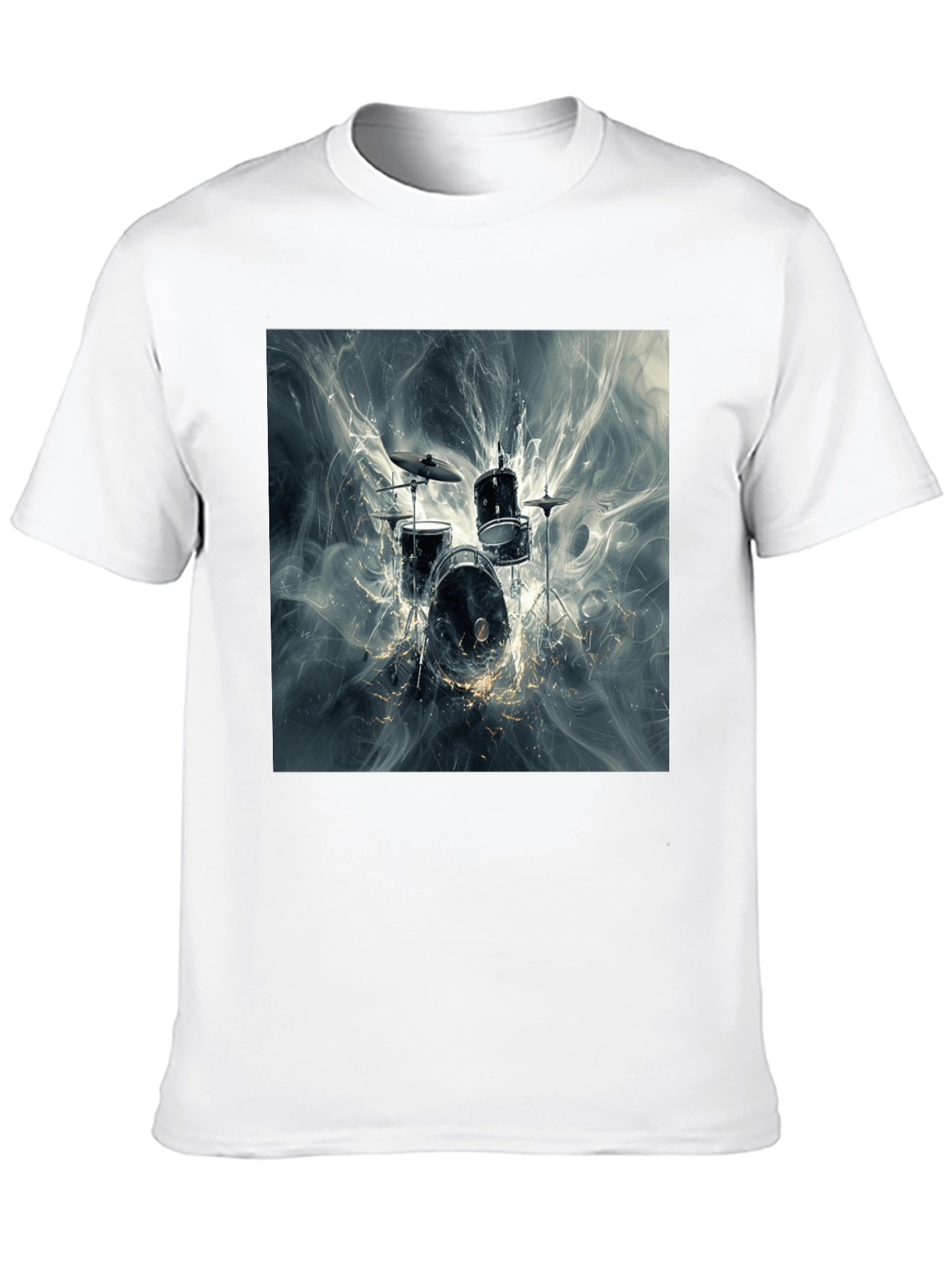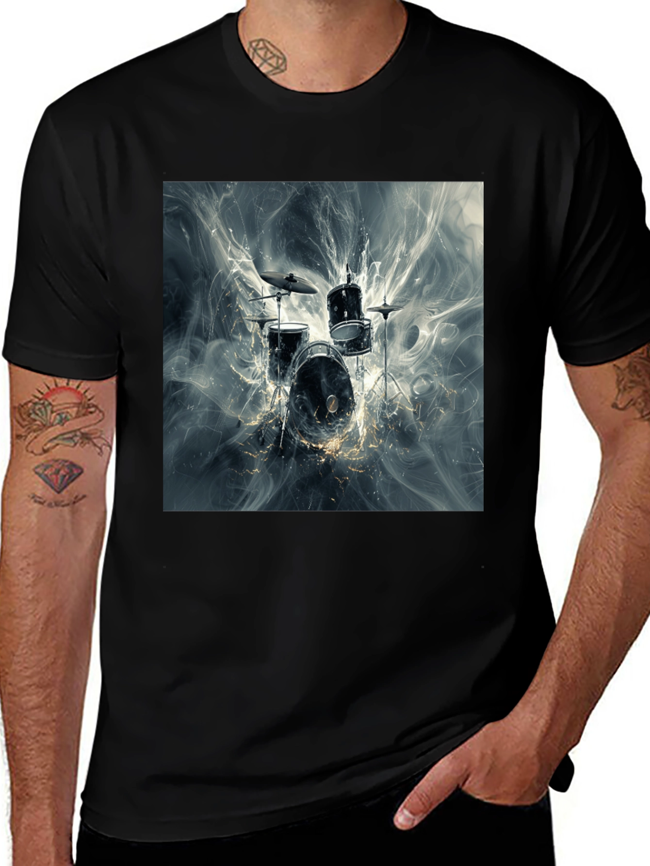 Rock out in style with this eye-catching black t-shirt featuring a vibrant graphic of a drum kit. The design appears to be digitally printed, showcasing incredible detail of a drum kit surrounded by energetic effects. The black t-shirt provides a stark, classic contrast, making the drum kit design pop. Made from a comfortable, breathable fabric, this tee is perfect for everyday wear or for showing off your love for music at concerts and events. A standout piece for any musician or music enthusiast's wardrobe.