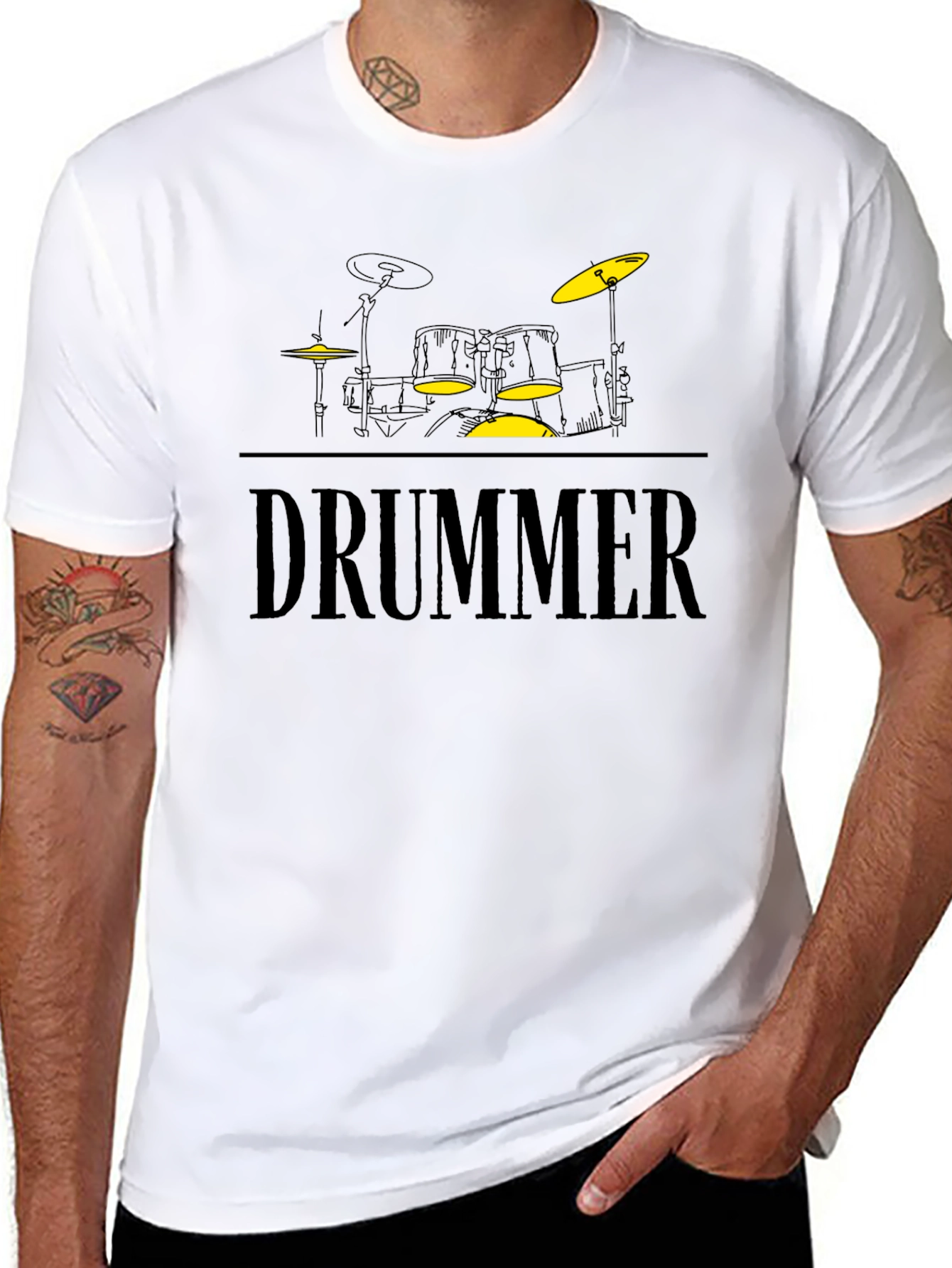 Show off your passion for music with this stylish black graphic t-shirt. Featuring a detailed line art depiction of a drum kit and the bold word "DRUMMER", this tee is perfect for musicians and music enthusiasts. The design incorporates yellow accents for a pop of color, making it eye-catching and unique. Made from comfortable, breathable fabric, it's ideal for everyday wear, band practices, or casual concerts. This shirt is a great way to express your love for drumming and makes a fantastic gift for the drummer in your life. Rock out in style!