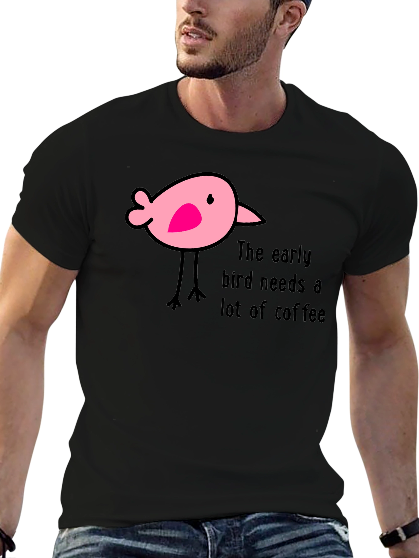 Start your day right with this charming black t-shirt! Featuring a cute pink bird graphic and the witty saying "The early bird needs a lot of coffee", this tee is perfect for the caffeine-loving early riser. Made from a comfortable-looking fabric, this relaxed-fit shirt is ideal for casual wear, running errands, or lounging at home. Show off your love for coffee and a good laugh with this unique and stylish t-shirt. Perfect as a gift for the coffee addict in your life or a treat for yourself!