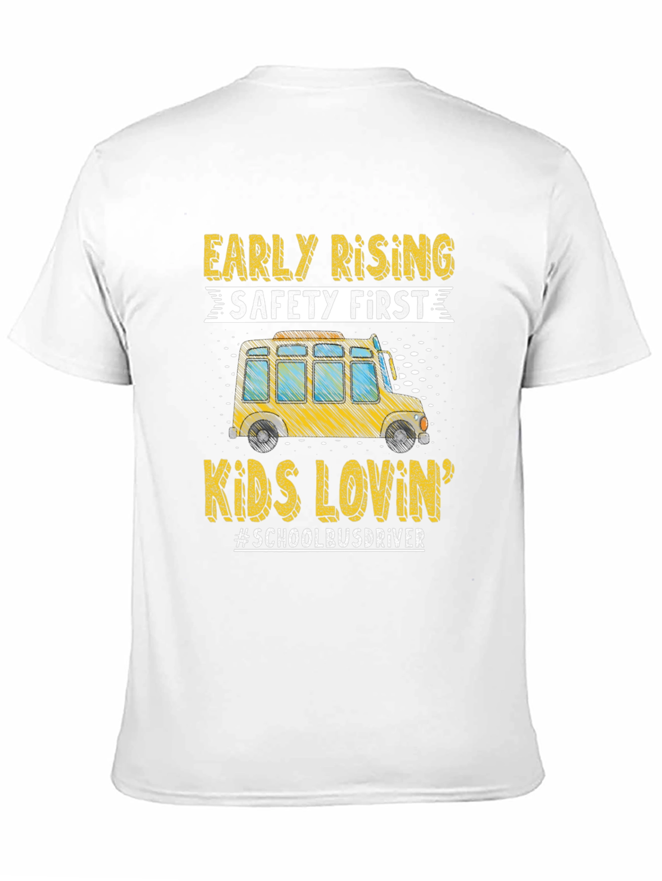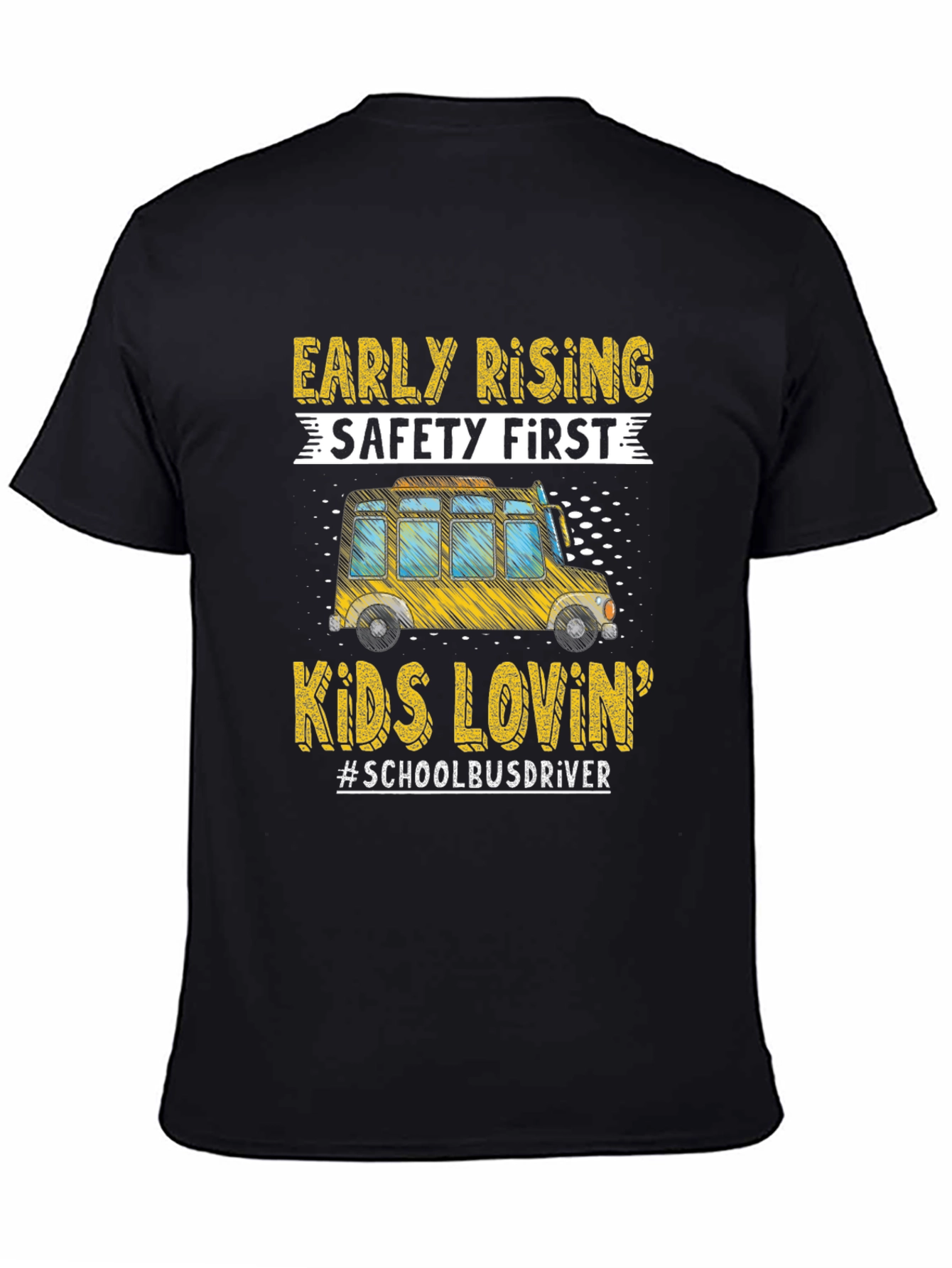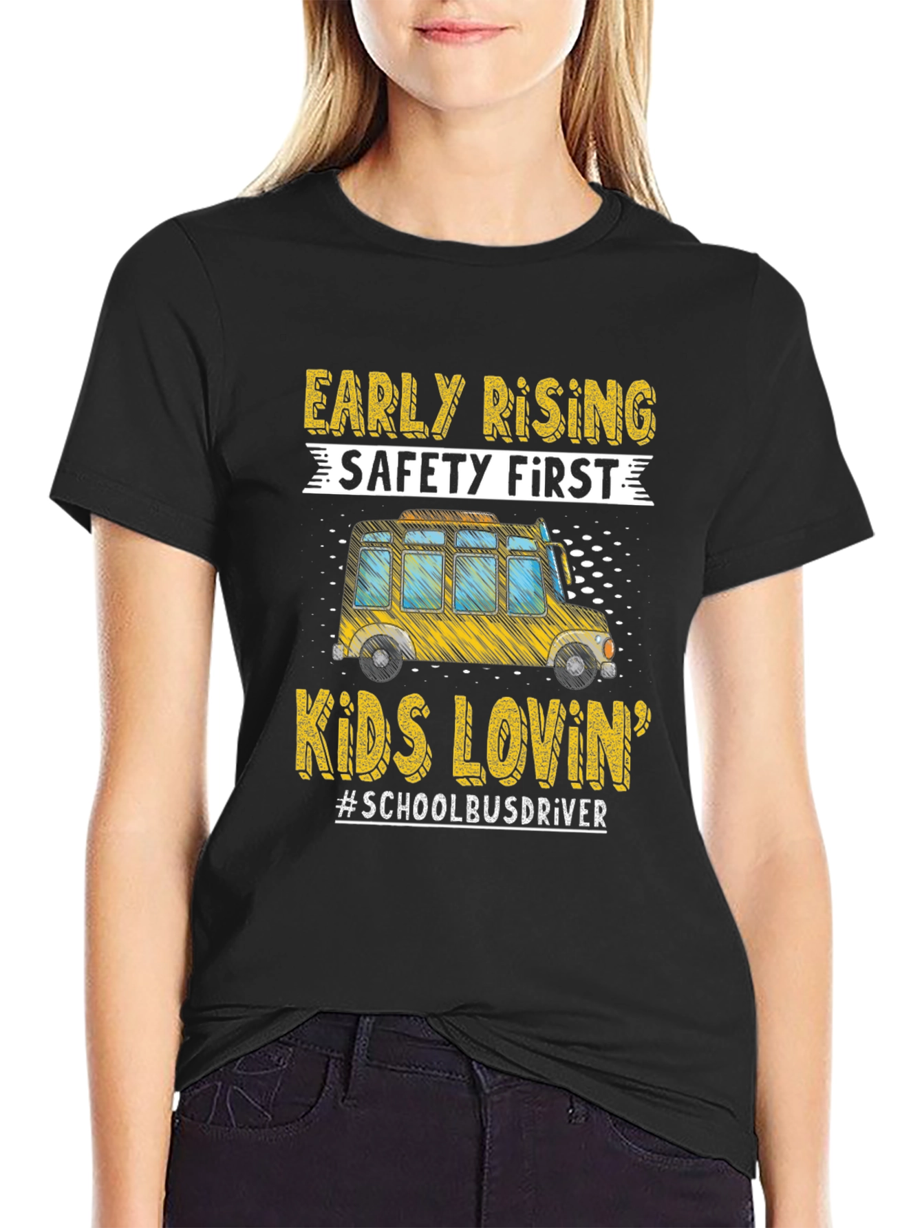 Show your appreciation for school bus drivers with this unique t-shirt! Made from a comfortable, dark fabric, this tee features a fun graphic with the words "Early Rising Safety First Kids Lovin'" along with a stylized image of a yellow school bus. The hashtag "#SCHOOLBUSDRIVER" is also included in the design. Perfect for bus drivers, parents, or anyone who wants to show their support for these essential workers. Wear it casually or give it as a thoughtful gift. This shirt is sure to be a hit with anyone who loves school buses and the people who drive them! Makes a great gift for back-to-school.