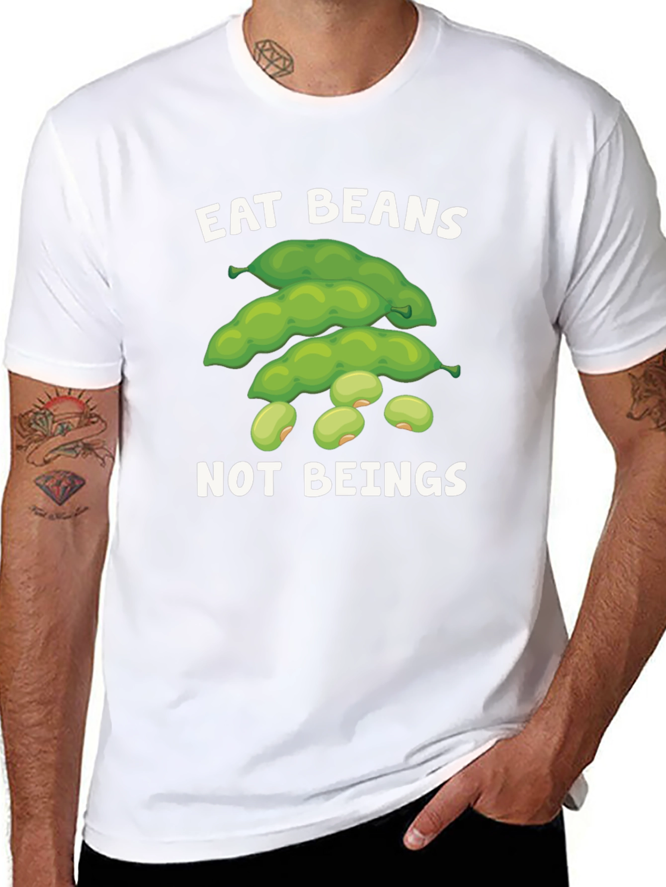 This black t-shirt features a humorous and thought-provoking message: "Eat Beans Not Beings." The design showcases an illustration of fresh green edamame, perfectly complementing the text. This shirt is ideal for vegetarians, vegans, or anyone with a passion for plant-based diets and sustainable living. Made from a comfortable fabric, it's perfect for casual wear, making a statement at the grocery store, or sparking conversations about food choices. Its simple yet eye-catching design is sure to turn heads and promote a mindful eating lifestyle. Wear your values proudly with this unique and conversation-starting tee.