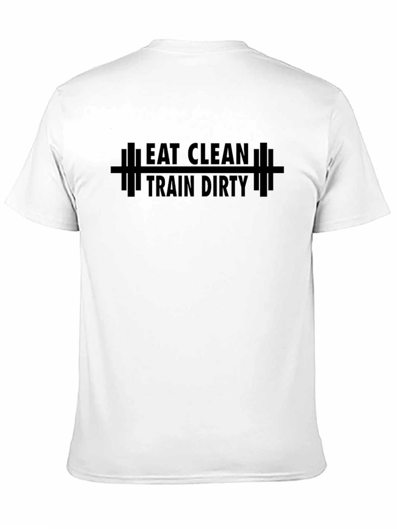This bold black t-shirt is perfect for fitness enthusiasts. Featuring a graphic design with the phrase "Eat Clean Train Dirty" between stylized barbell images, it showcases a commitment to a healthy lifestyle. The shirt appears to be made from comfortable, breathable fabric, ideal for workouts or casual wear. The dark color enhances the message, making it a standout piece in your athletic wardrobe. Whether you're hitting the gym or just want to show off your dedication to fitness, this t-shirt is the perfect choice. The classic fit ensures comfort and ease of movement, making it a versatile addition to any active individual's closet.