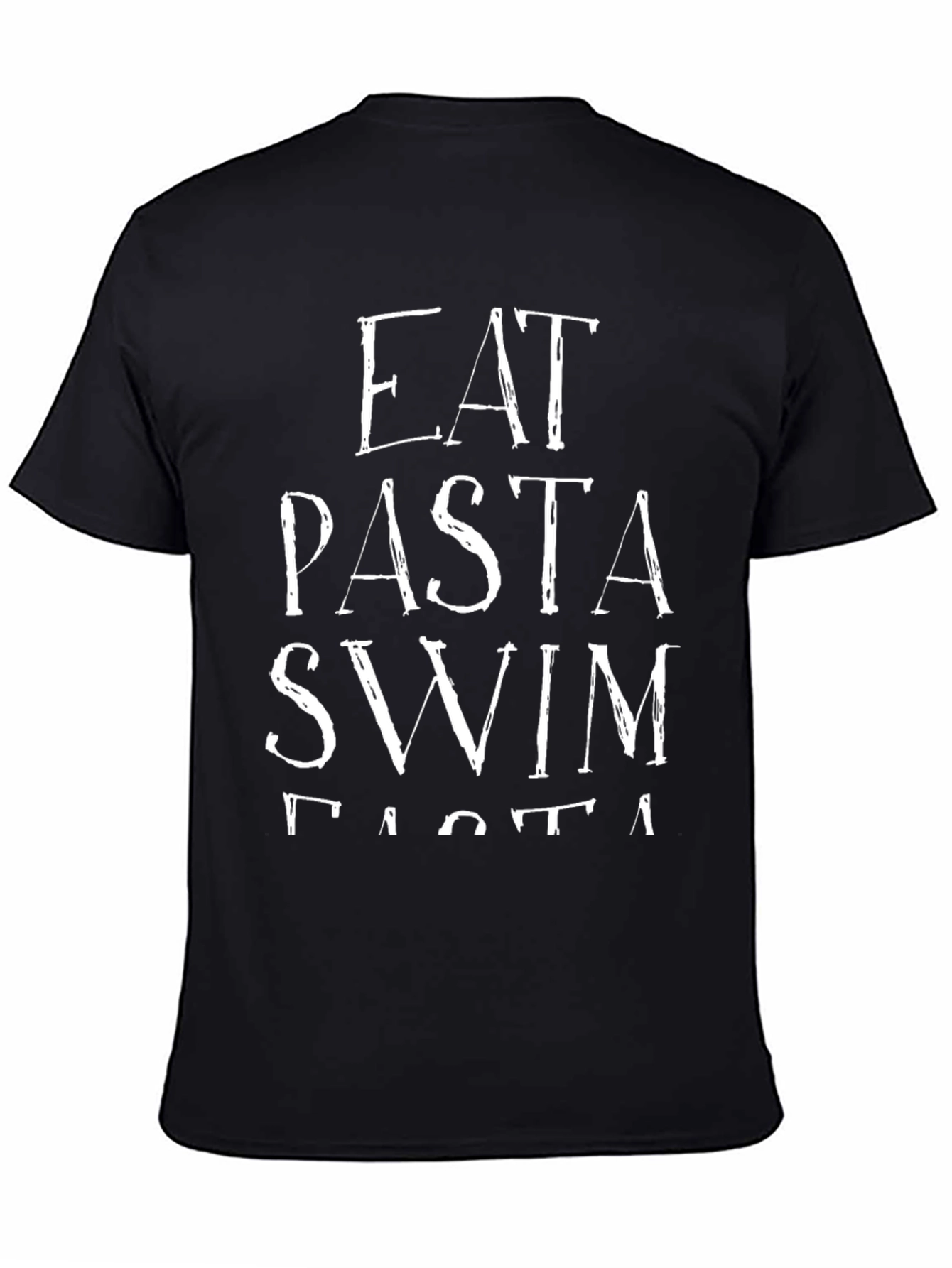 Show off your love for carbs and the pool with this fun graphic t-shirt. The shirt is black and features the playful phrase "EAT PASTA SWIM" in a distressed white font. Made from a soft, comfortable material, this tee is perfect for casual wear, workouts, or relaxing by the water. Get yours today!
