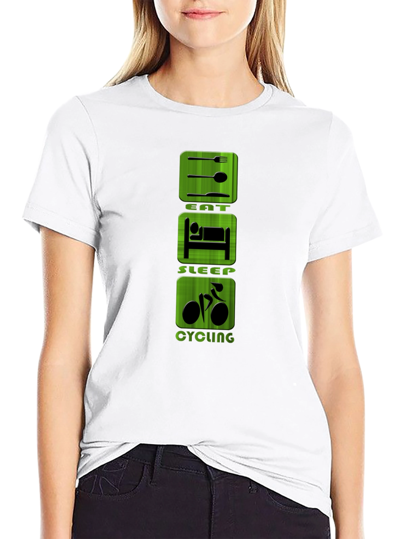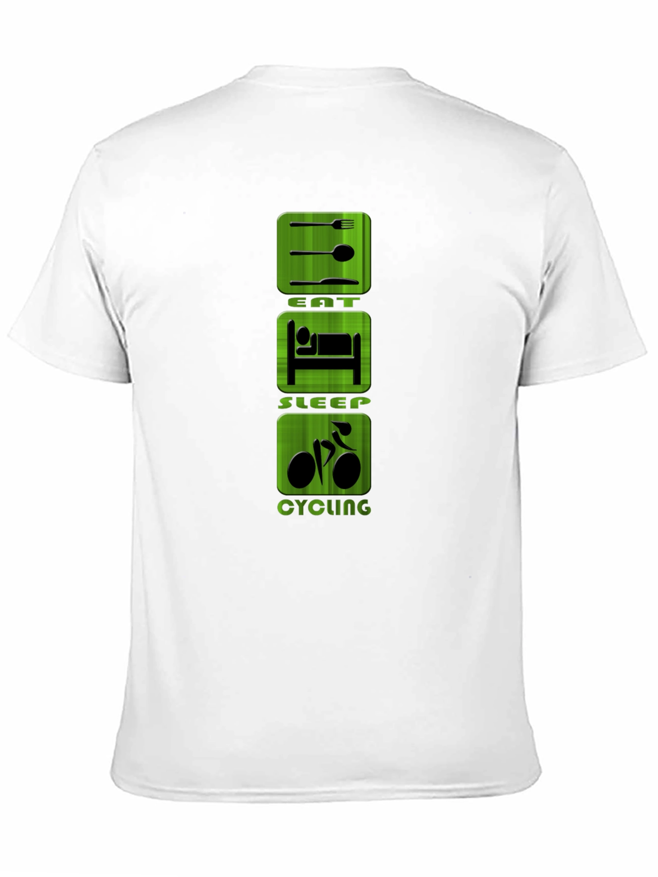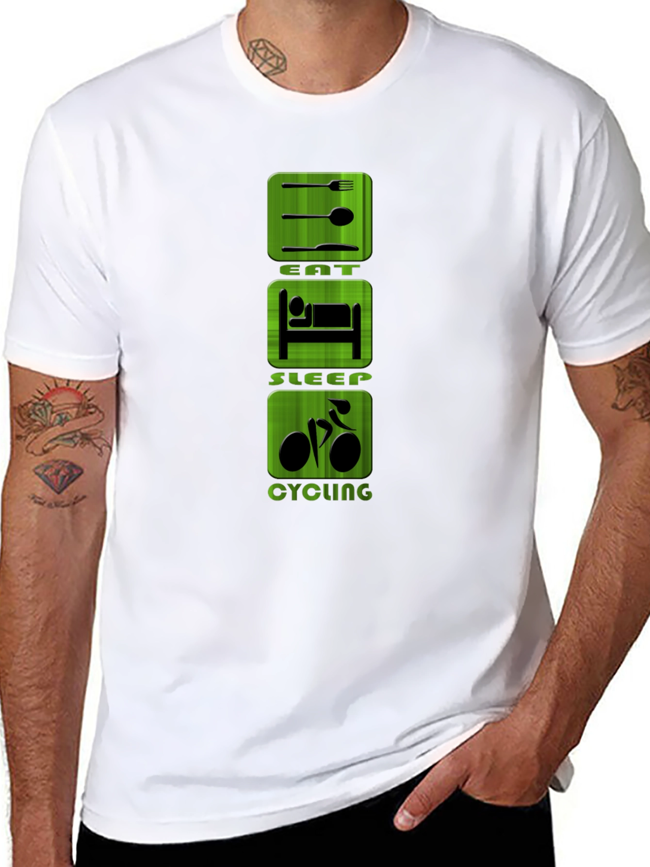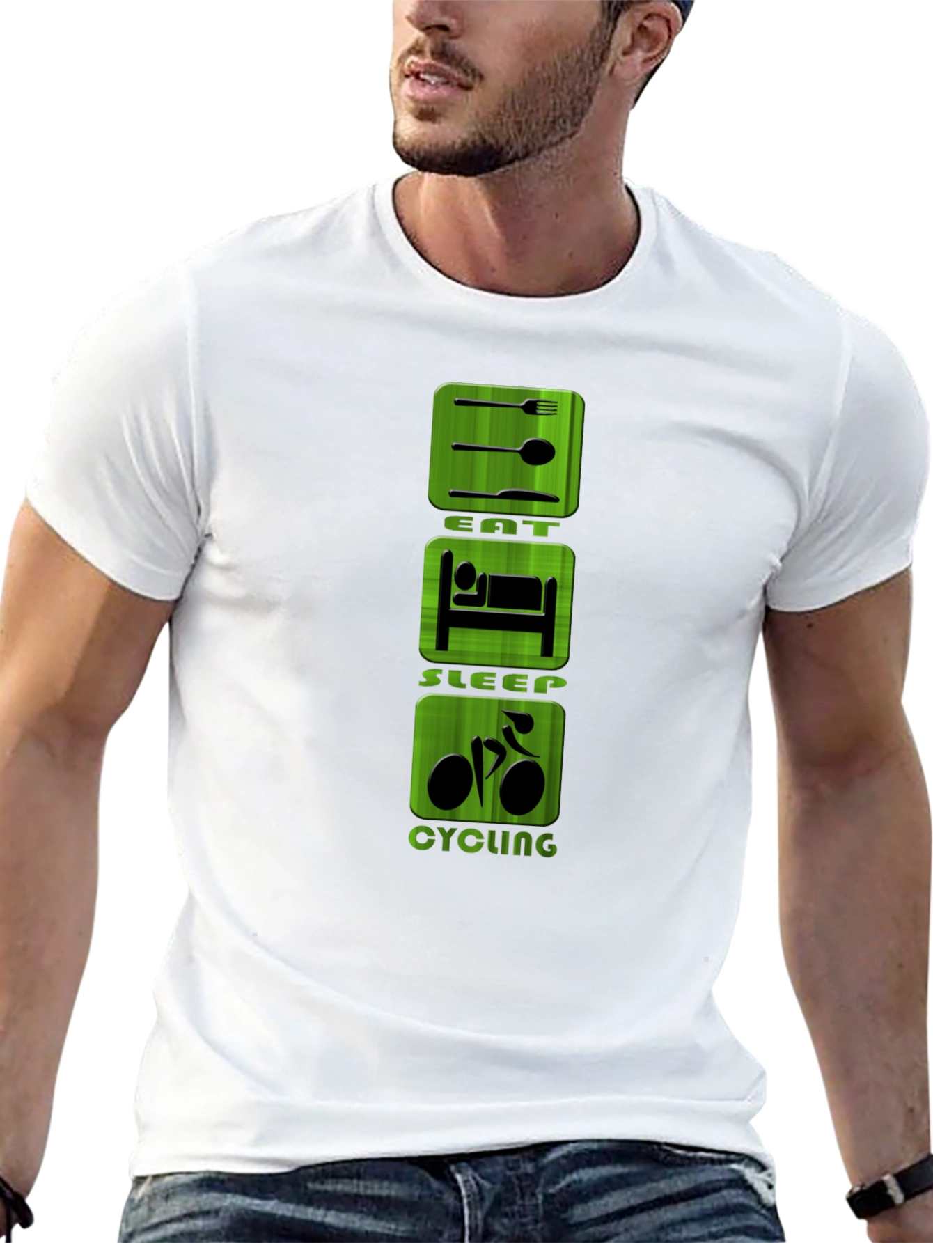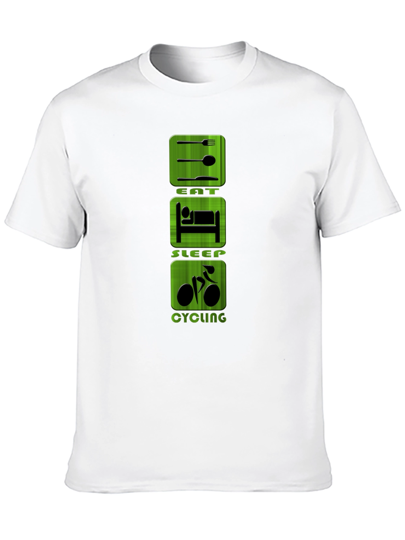 Show off your love for cycling with this eye-catching black t-shirt. The shirt features a fun and unique graphic design that illustrates the perfect day for a cyclist: Eat, Sleep, and Cycling. The design uses a green square background with icons of a fork and spoon, a bed, and a bicycle with the text in black. Made from a comfortable material, this t-shirt is perfect for everyday wear, cycling events, or casual outings. Great gift for cyclists and cycling enthusiasts.
