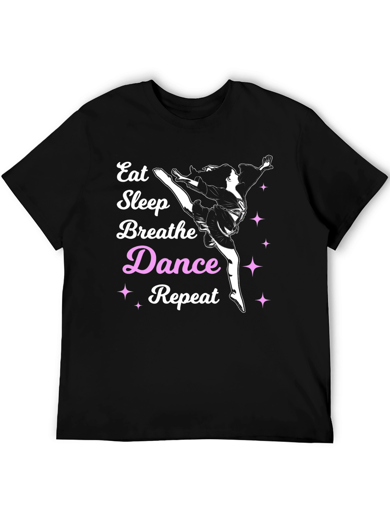 Show off your passion for dance with this eye-catching graphic tee! The black t-shirt features the text "Eat Sleep Breathe Dance Repeat," with "Dance" highlighted in pink, alongside an illustration of a dancer in motion. The design also includes sparkling star accents. Made from what appears to be a soft and breathable material, this tee offers both style and comfort. Perfect for dance classes, rehearsals, or casual everyday wear, this shirt is sure to turn heads and spark conversations. Express your love for dancing with this cool t-shirt!