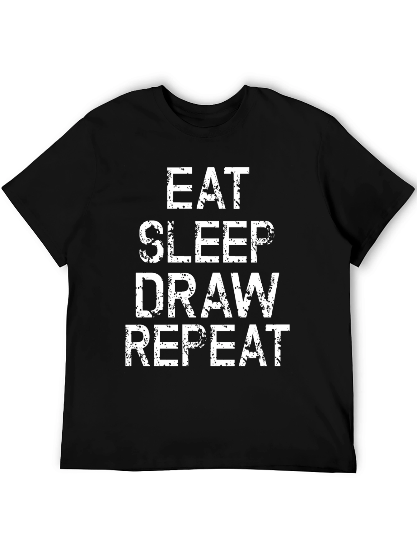Show off your passion with this fun and stylish "Eat Sleep Draw Repeat" T-shirt. This black tee features a bold, distressed white graphic, perfect for artists, illustrators, and anyone who loves to draw. Made from what appears to be soft, breathable cotton, this shirt is comfortable for everyday wear. The classic fit makes it a versatile addition to any wardrobe. Wear it while creating your next masterpiece, hanging out with friends, or simply expressing your artistic side. Makes a great gift for the creative people in your life! Grab yours today and let the world know what you love to do.