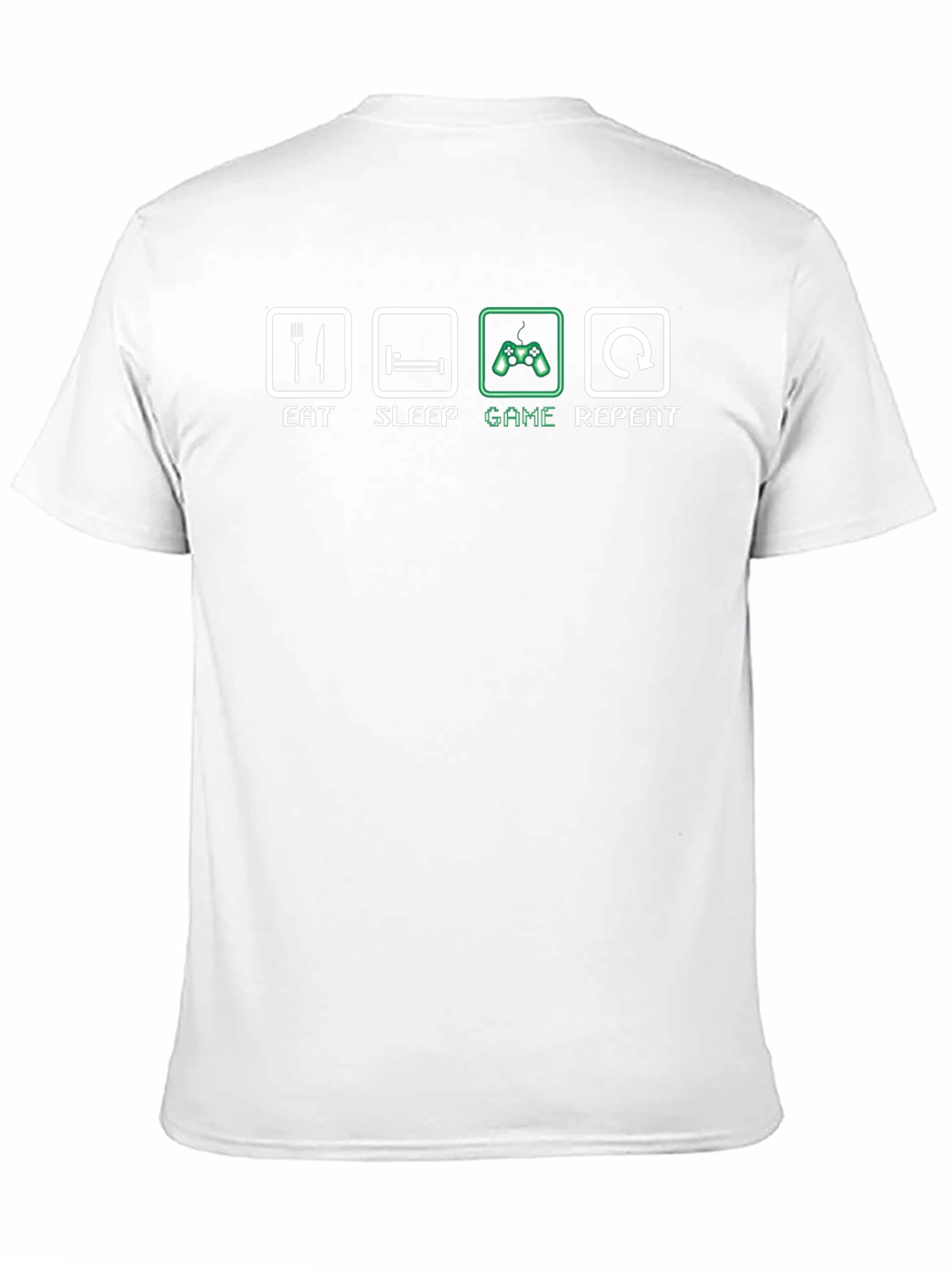Show off your passion for gaming with this stylish black t-shirt. The shirt features a playful graphic design with the phrase "Eat Sleep Game Repeat", alongside corresponding icons of cutlery, a bed, a game controller, and a looping arrow. Ideal for gamers, the design is printed with durable materials for a long-lasting, vibrant look. Perfect for casual wear, gaming events, or as a gift for the gamer in your life, this tee combines comfort and personality.