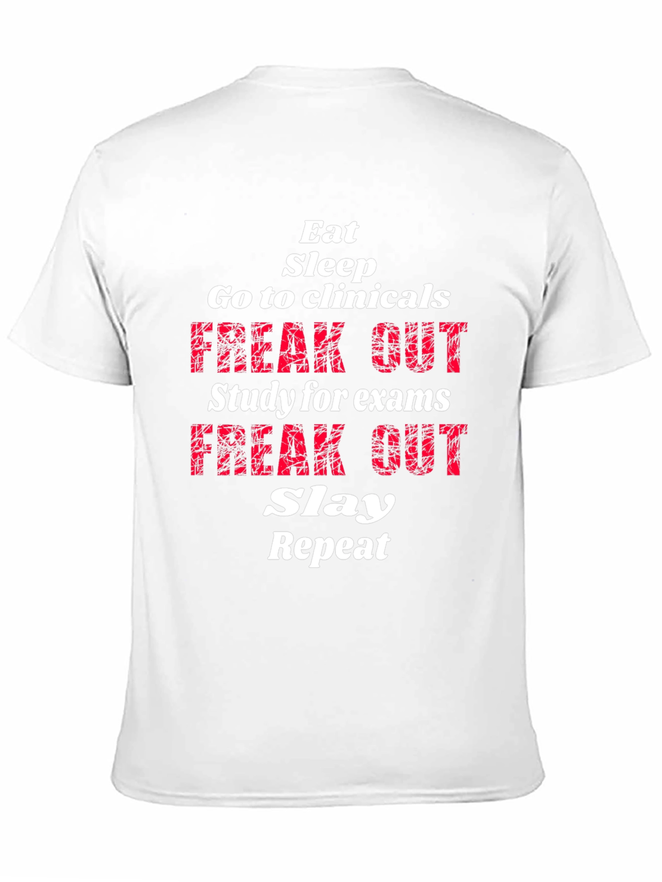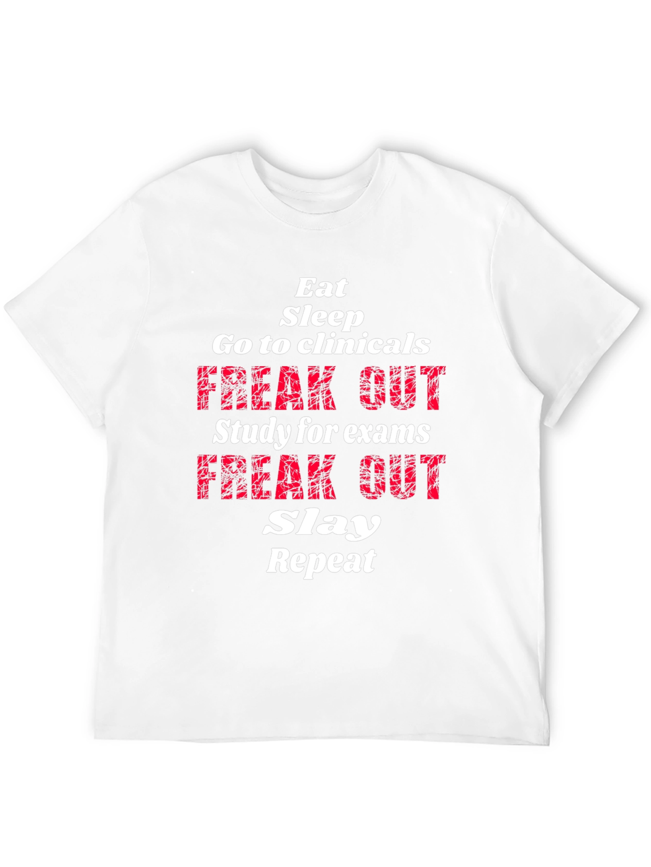 Show off your dedication with this black graphic t-shirt. Bold white and red text reads: Eat, Sleep, Go to Clinicals, Freak Out, Study for Exams, Freak Out, Slay, Repeat. Perfect for students, nurses, and medical professionals who understand the grind. Made from comfortable, breathable fabric for all-day wear. Great for clinicals, study sessions, or casual outings. Makes a great gift for your favorite hardworking student. This tee combines comfort with a touch of humor, perfect for those who balance demanding schedules with a can-do attitude.