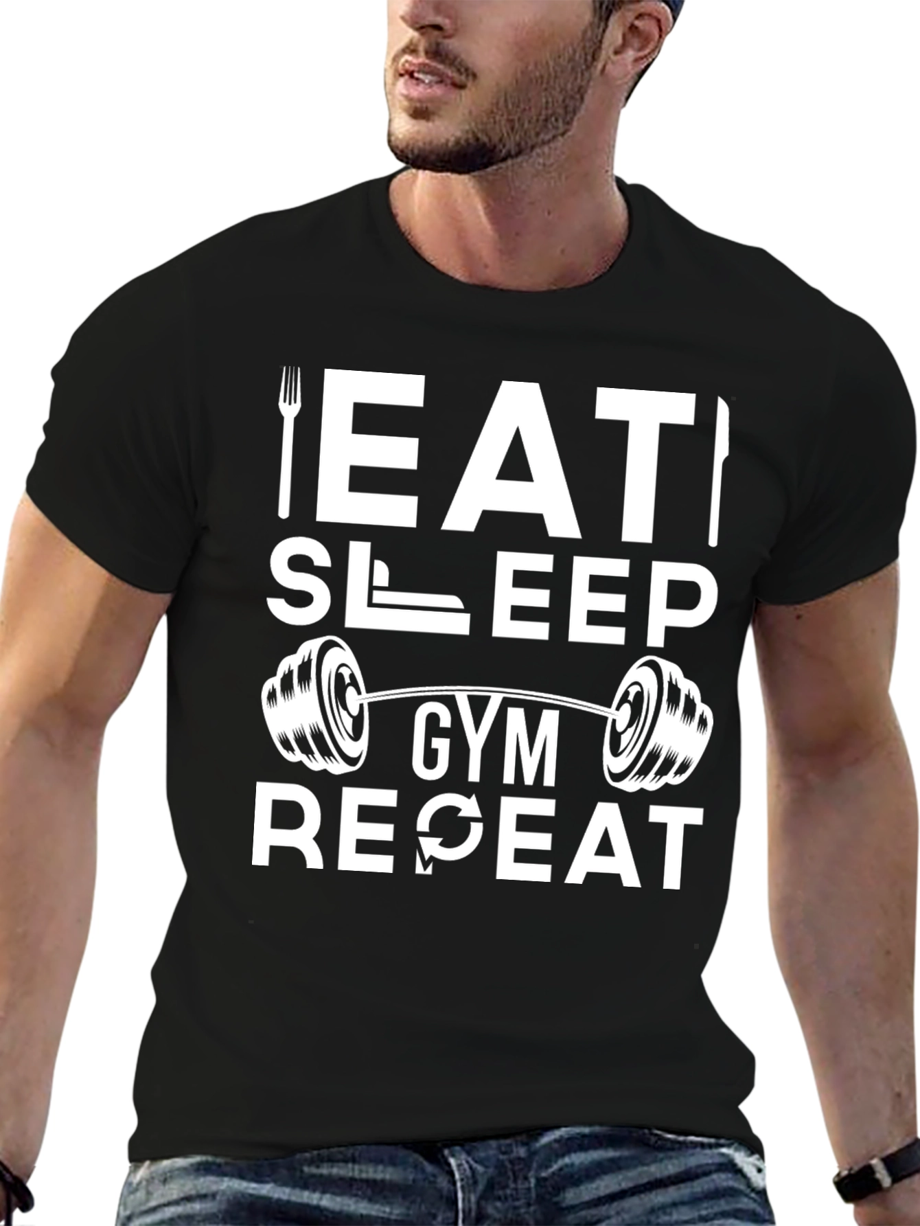 Show off your dedication to fitness with this eye-catching black t-shirt. Featuring the bold white text 'Eat Sleep Gym Repeat', accompanied by a fork icon, bed icon, and a barbell graphic, this shirt is perfect for gym enthusiasts and athletes. The classic fit and comfortable fabric make it ideal for workouts or casual wear. Express your passion for a healthy lifestyle with this stylish and motivational tee.