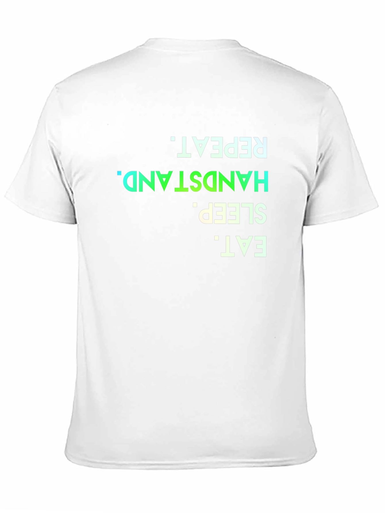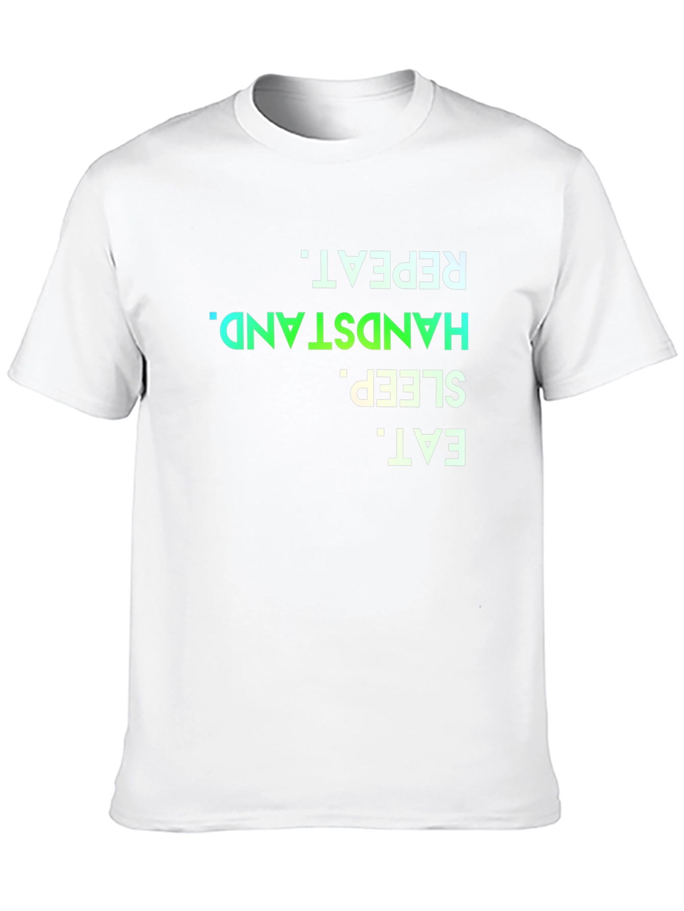 Showcase your passion for handstands with this stylish black T-shirt. The design features the phrase "Eat. Sleep. Handstand. Repeat." printed vertically in a gradient of white, green, and turquoise, creating a visually appealing statement. Made from comfortable fabric, this short-sleeve tee is perfect for everyday wear, workouts, or as a fun conversation starter among gymnastics and fitness enthusiasts. The classic crew neck and relaxed fit ensure a comfortable fit, making it ideal for both men and women who love handstands and active lifestyles. Wear it to the gym, yoga class, or out and about to share your enthusiasm for this challenging and rewarding activity.
