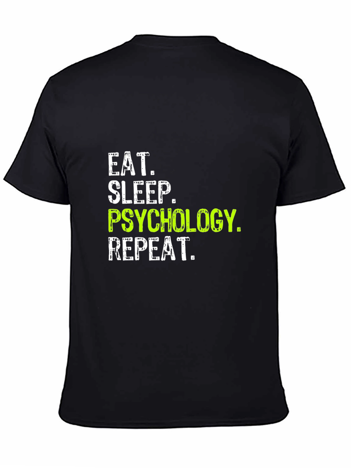 Show off your passion for psychology with this eye-catching black t-shirt. The shirt features the phrase "Eat. Sleep. Psychology. Repeat." in a bold, distressed white font, with "Psychology" highlighted in a vibrant lime green. Made from a comfortable, breathable fabric, this tee is perfect for psychology students, therapists, or anyone with an interest in the field. Wear it to class, the office, or casual outings to spark conversations and share your love for the study of the mind. The design is printed on a classic fit black tee, providing a versatile and stylish look.