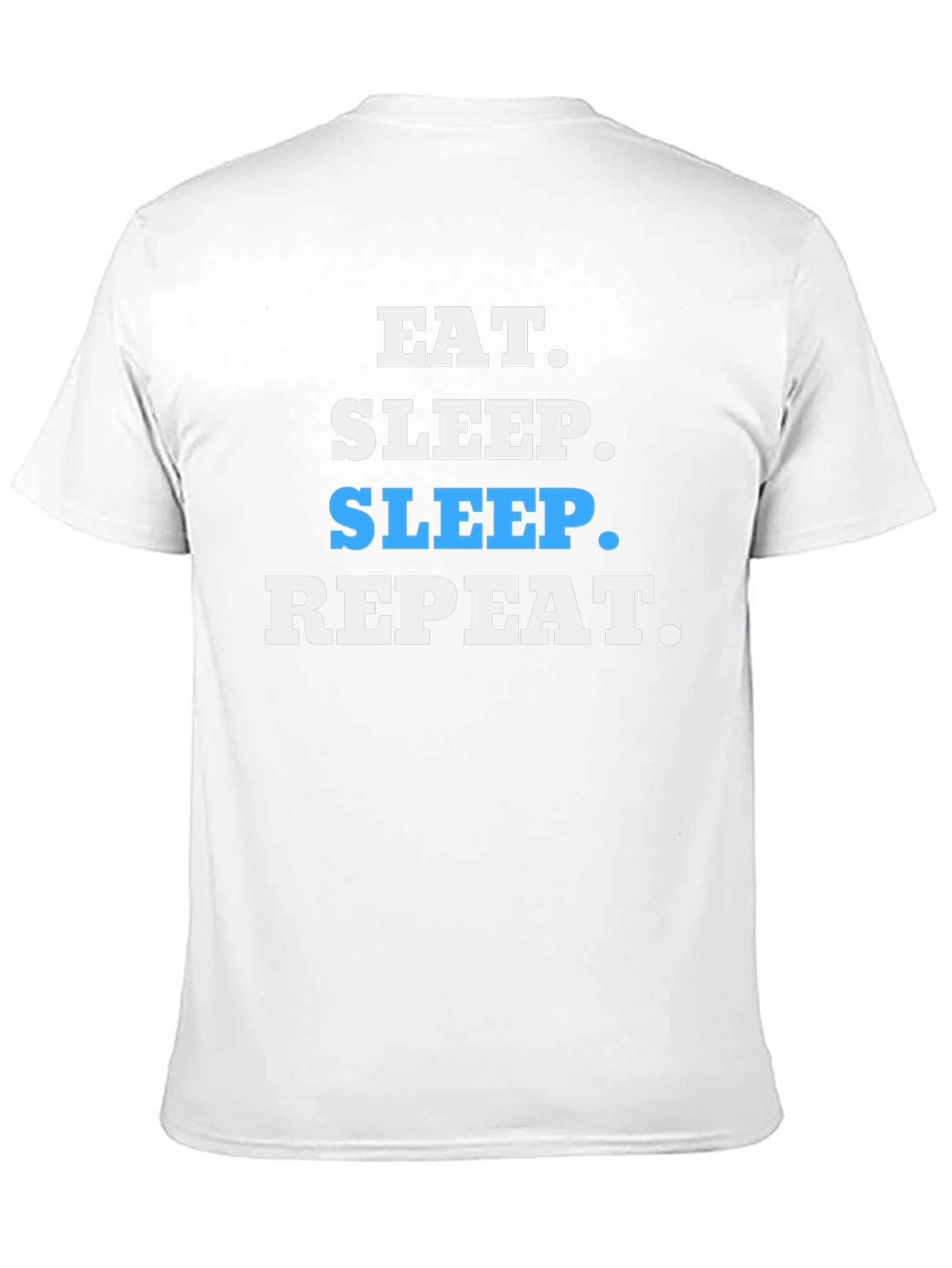 This classic black t-shirt features a bold, playful slogan that reads "EAT. SLEEP. SLEEP. REPEAT." in a stacked, eye-catching design. The word "SLEEP" is emphasized with a cool blue color, adding a touch of uniqueness to the design. Made from a soft and comfortable fabric, this tee is perfect for casual wear. It's an ideal choice for those who appreciate humor and want to express their laid-back lifestyle. Wear it while lounging at home, hanging out with friends, or hitting the gym. A fun and stylish addition to any wardrobe, this slogan tee is sure to spark conversations and bring smiles.