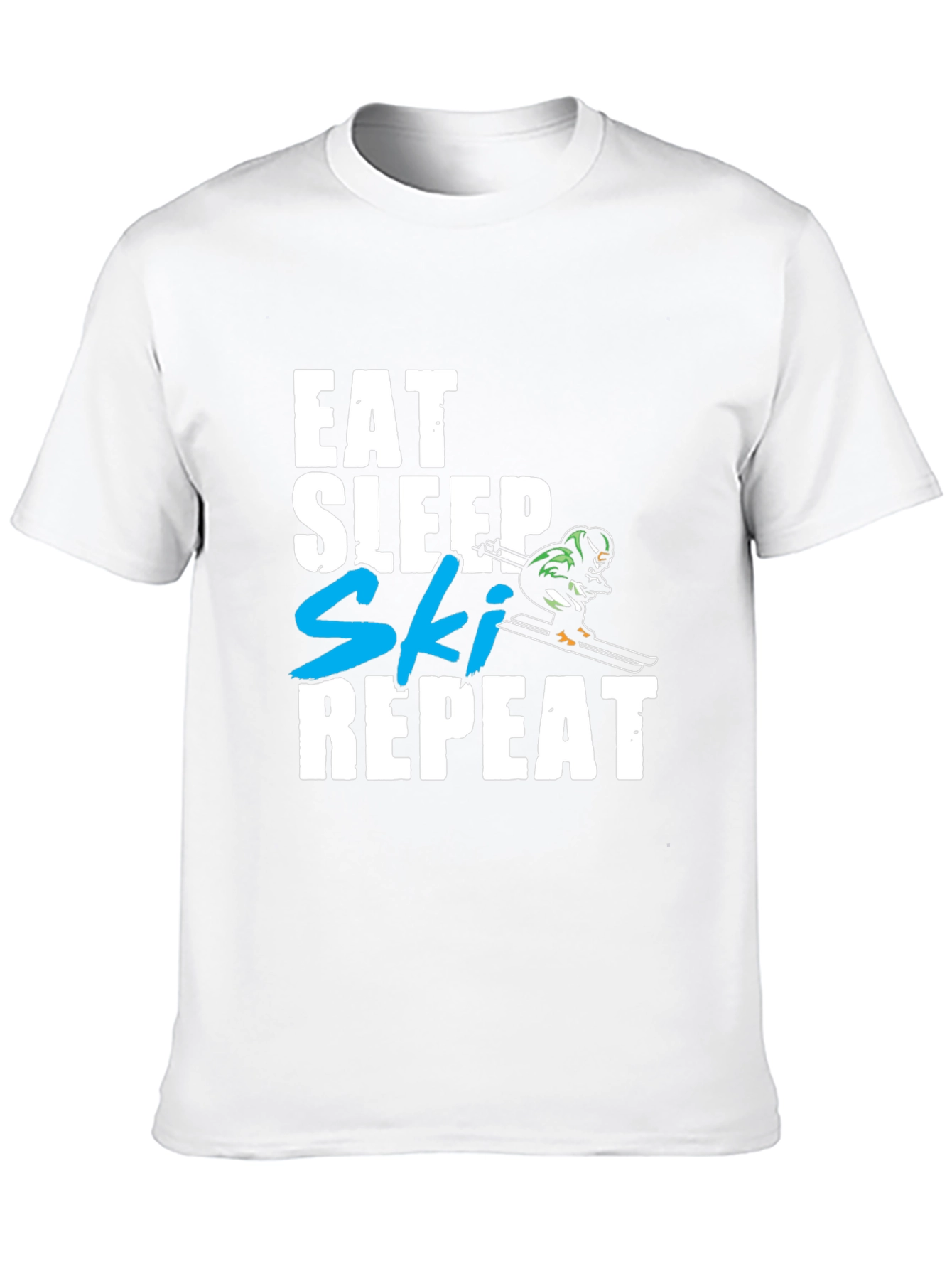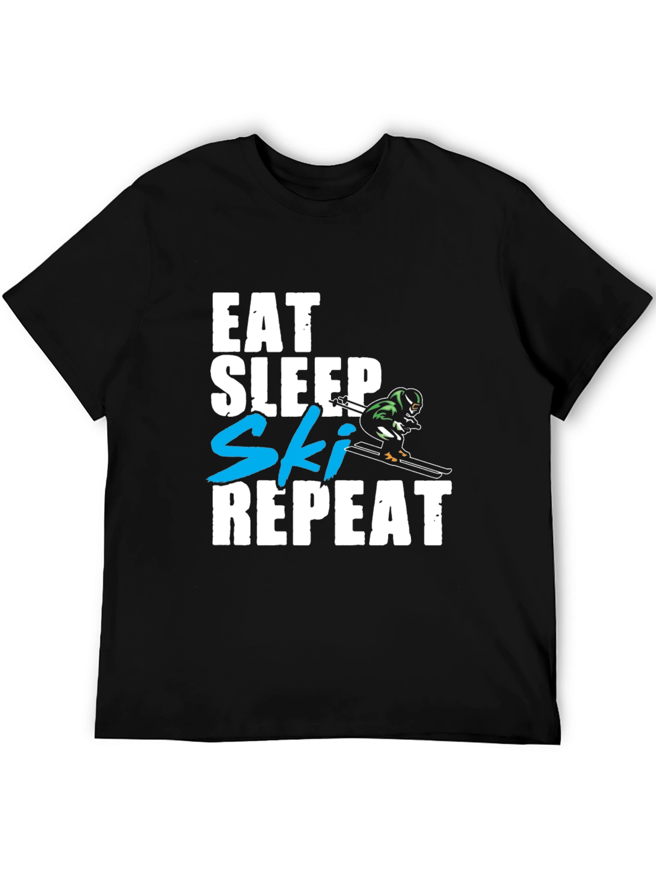 Show off your passion for skiing with this fun and stylish black graphic t-shirt. The tee features the witty phrase "Eat Sleep Ski Repeat" in a bold white and blue font, complete with a skier graphic, perfect for ski enthusiasts. Made from what appears to be comfortable, breathable cotton, this casual tee is ideal for everyday wear, hitting the slopes, or lounging après-ski. The classic crew neck and short sleeves offer a relaxed fit. A must-have for any ski lover's wardrobe. Grab yours and represent your favorite winter sport!