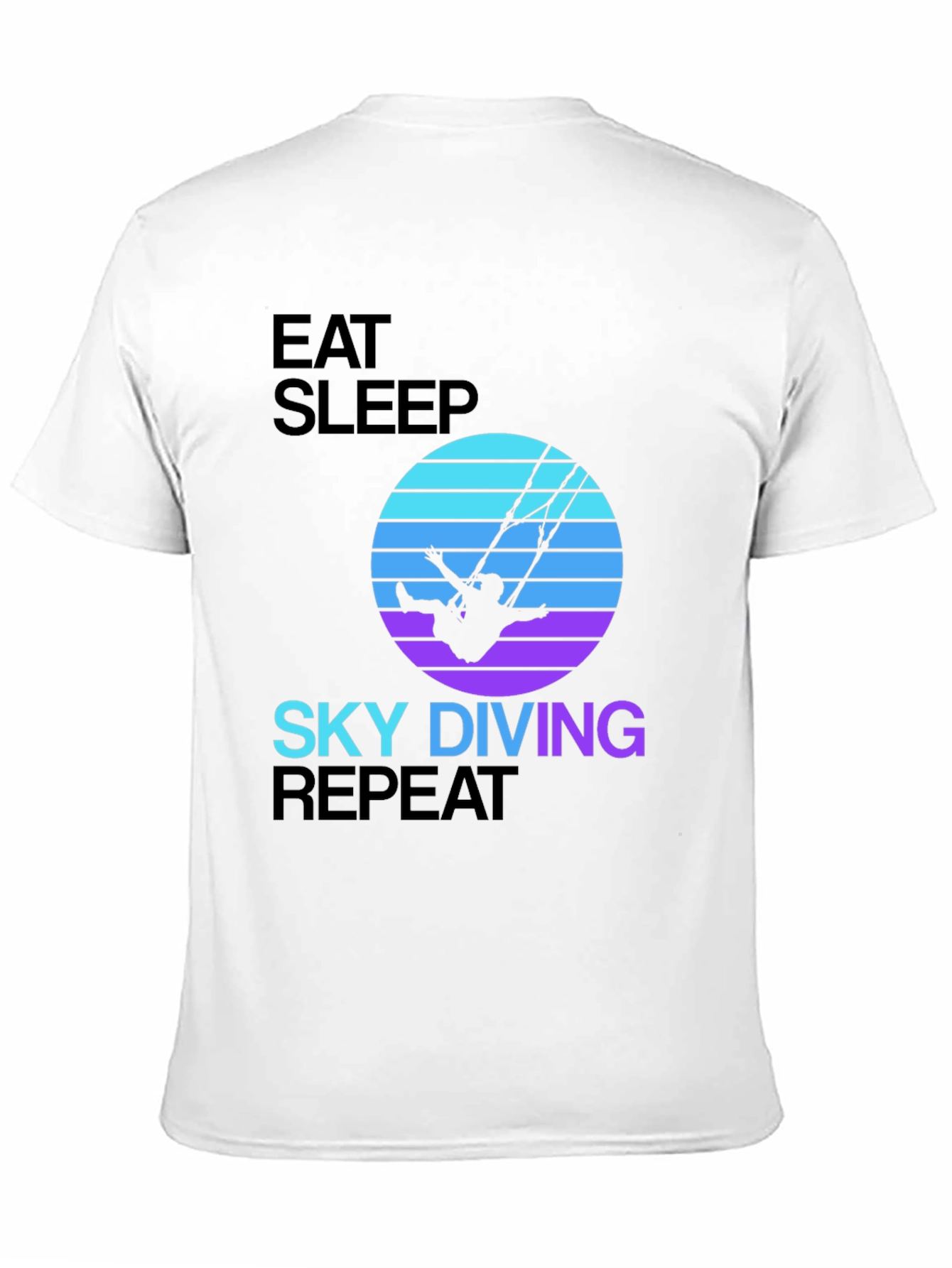 Show off your passion for skydiving with this stylish black T-shirt. Featuring the words "EAT SLEEP SKY DIVING REPEAT" in bold font, this tee is perfect for skydiving enthusiasts. A vibrant graphic of a skydiver silhouette against a retro-style sun adds a cool, eye-catching element. Made from comfortable fabric, this shirt is great for everyday wear, casual outings, or even as a conversation starter at the dropzone. Express your love for the sport with this unique and comfortable T-shirt!