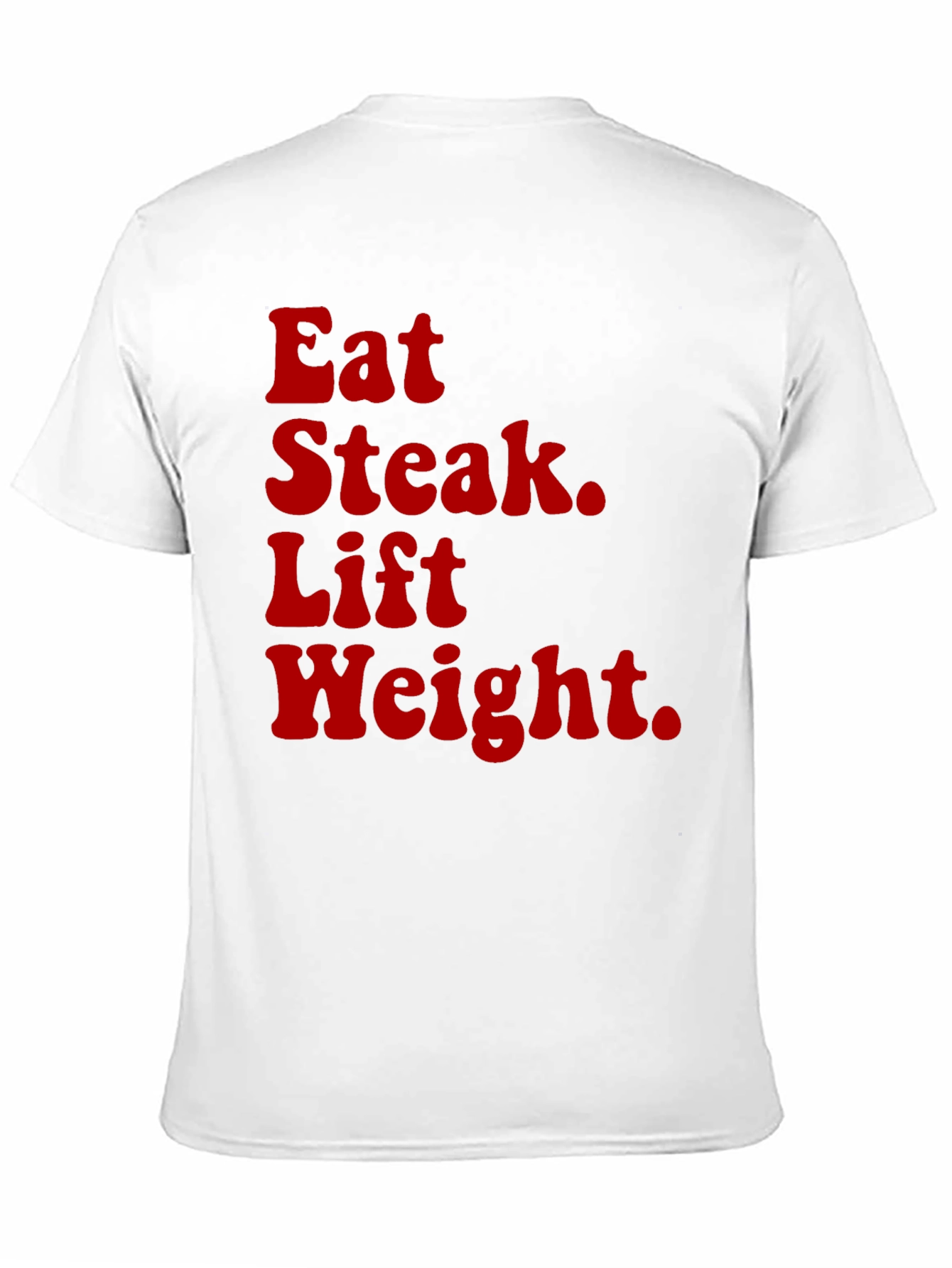Show off your fitness lifestyle with this bold black graphic tee. This shirt features the phrase "Eat Steak. Lift Weight." in a distinct red font, making a statement wherever you go. Made from comfortable fabric, this tee is perfect for workouts, casual wear, or to express your passion for fitness. Pair it with your favorite jeans or athletic shorts for a complete look. Get yours today!