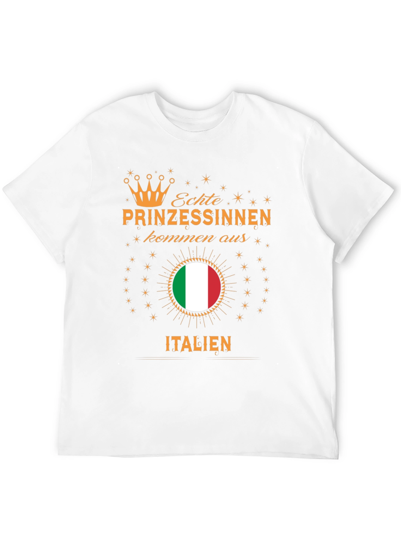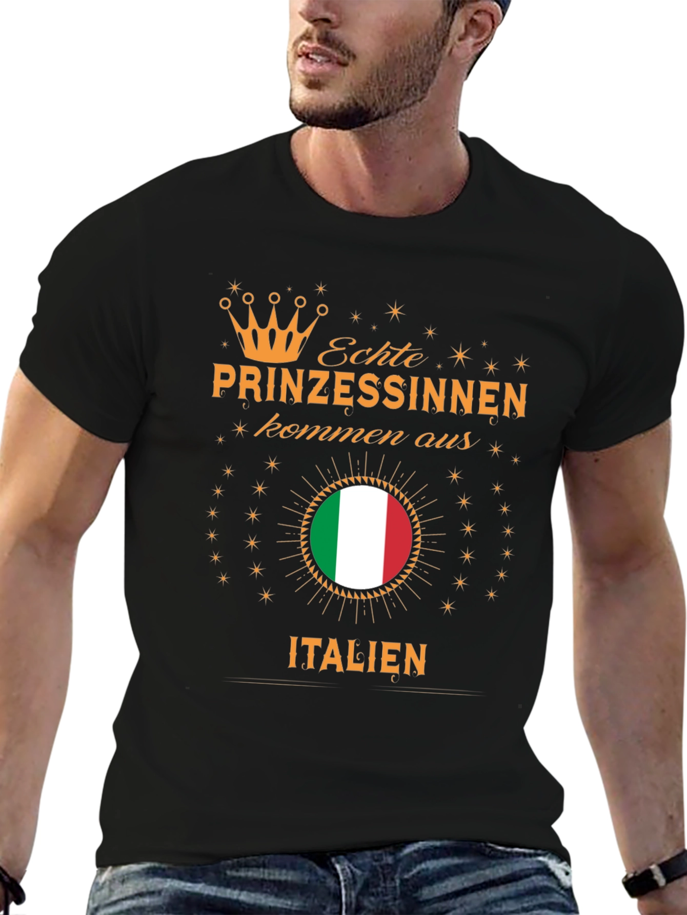 Show off your love for Italy with this unique T-shirt. The design features a crown above the phrase "Echte Prinzessinnen kommen aus Italien," which translates to "Real Princesses come from Italy". Below the phrase is an Italian flag. Made from a comfortable black material, this T-shirt is perfect for casual wear or as a gift for someone who has Italian heritage. It is perfect for everyday wear, vacations, or showing off your Italian pride. Get yours today!