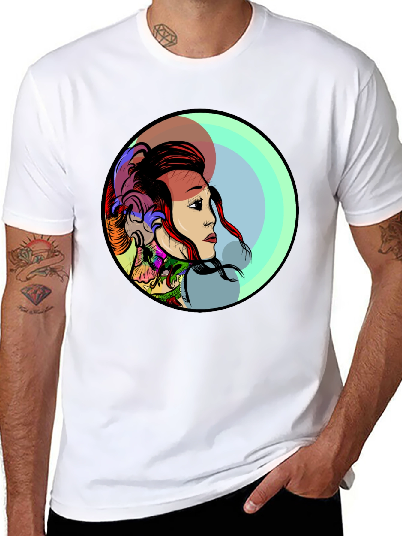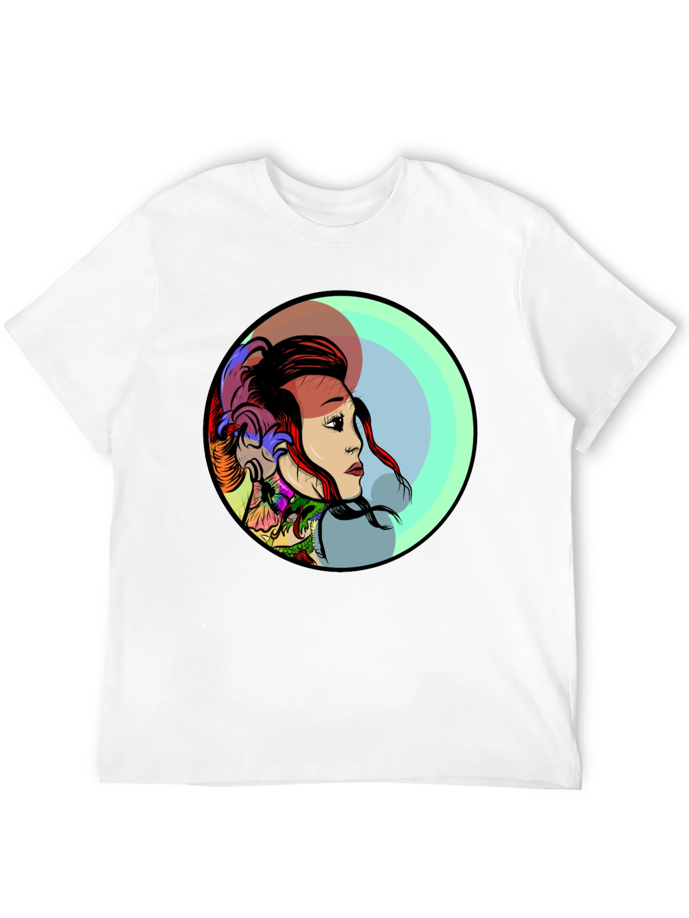 Make a bold statement with this striking black t-shirt! Featuring a vibrant, colorful graphic print of a woman's profile with intricate tattoo details, this tee is perfect for those who appreciate unique art. The eye-catching design is set against a series of colorful circular backgrounds, adding depth and visual appeal. Crafted from comfortable, breathable material, this shirt is ideal for everyday wear, casual outings, or expressing your individuality. Pair it with jeans or shorts for a cool, effortless look that's sure to turn heads. Add a touch of edgy style to your wardrobe with this must-have tee!