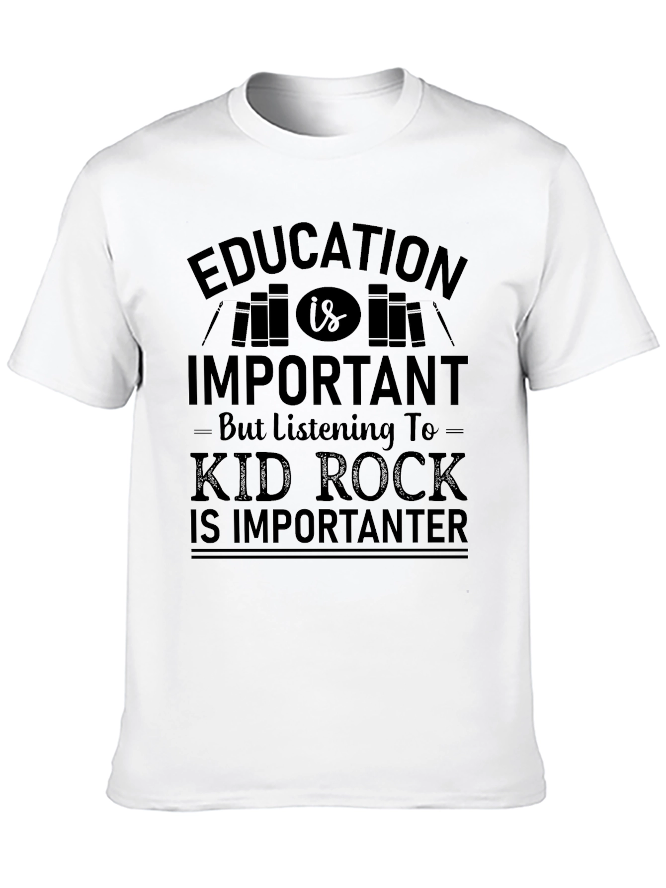 Rock your style with this black graphic tee! This shirt features the bold statement 'Education is Important, But Listening to Kid Rock is Importanter' displayed prominently. The playful message makes it a fun conversation starter. Perfect for casual wear, concerts, or expressing your unique sense of humor. The classic fit and soft fabric ensure all-day comfort. A must-have for any Kid Rock fan looking to make a statement!