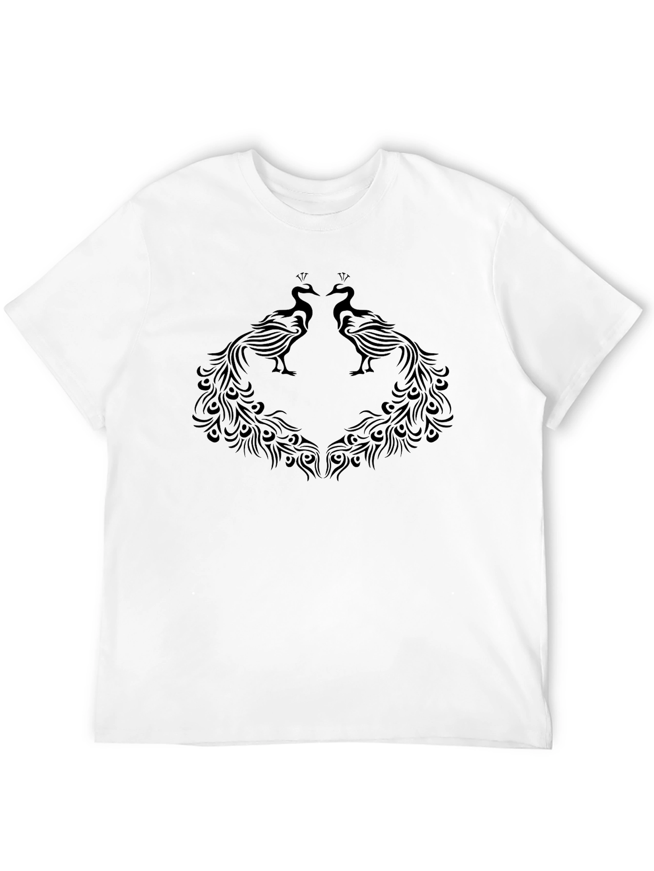 This stylish black t-shirt features a striking graphic print of two peacocks facing each other. The elegant design showcases intricate detailing of the birds' plumage, creating a sophisticated and eye-catching look. Made from a soft, comfortable fabric, this tee is perfect for everyday wear or for adding a touch of flair to any casual outfit. Its classic fit makes it versatile, easily paired with jeans, shorts, or even dressed up with a blazer. Show off your unique sense of style with this bold and artistic peacock tee. Ideal for those who appreciate unique fashion and want to make a statement.