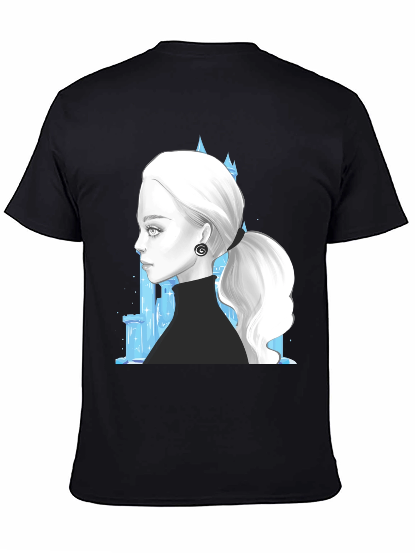 Elevate your wardrobe with this stylish black t-shirt. The eye-catching design features an elegant woman in profile with a black turtleneck, showcasing a sophisticated yet modern aesthetic. Behind her is an artistic rendering of an ice castle, adding a touch of fantasy and intrigue to the overall look. The print is high-quality and sure to turn heads. Made from comfortable materials, this tee is perfect for everyday wear. Pair it with jeans for a casual outing or dress it up with a blazer for a more polished look. It's versatile, fashionable, and a must-have for those who appreciate unique graphic designs.