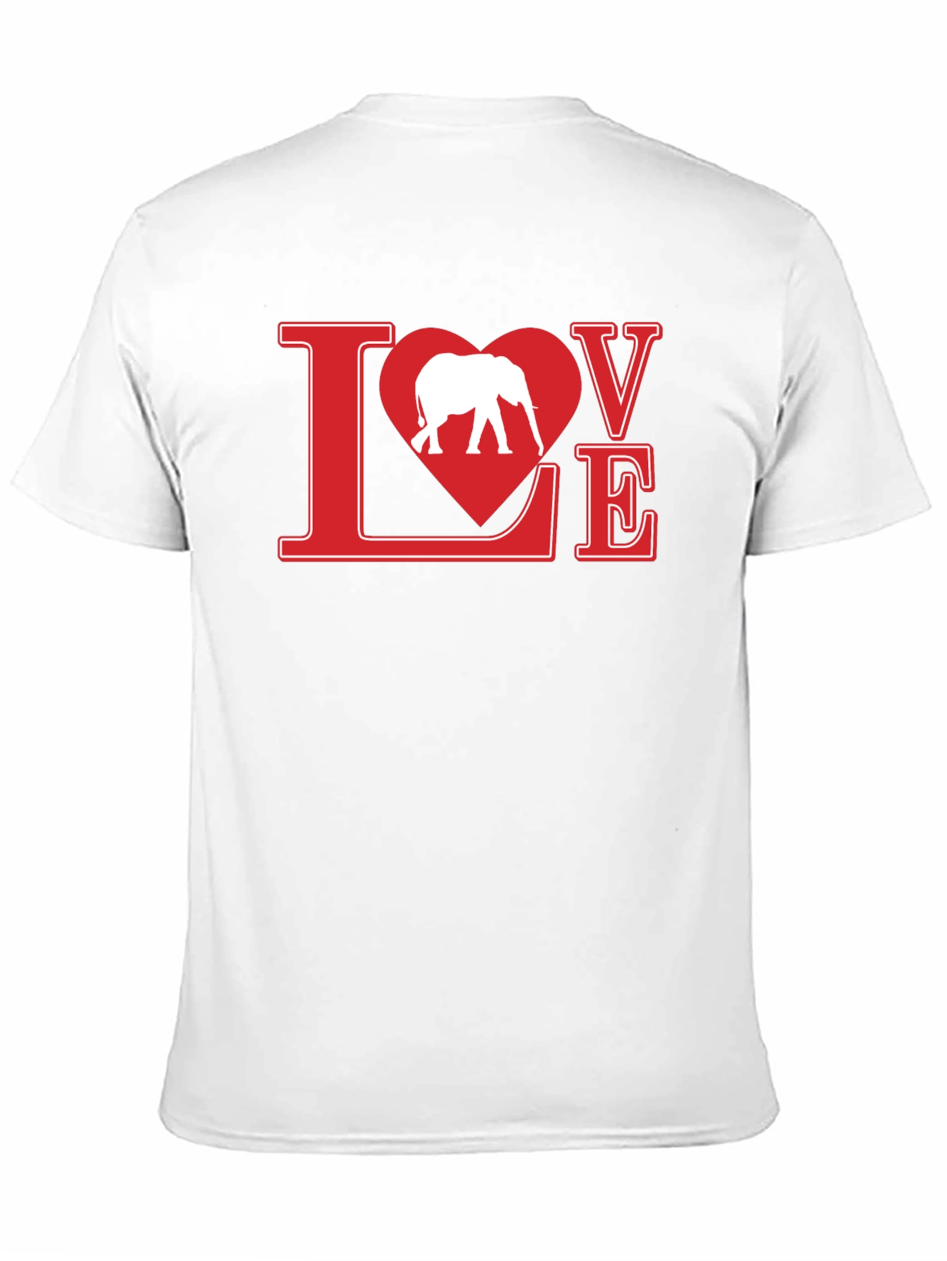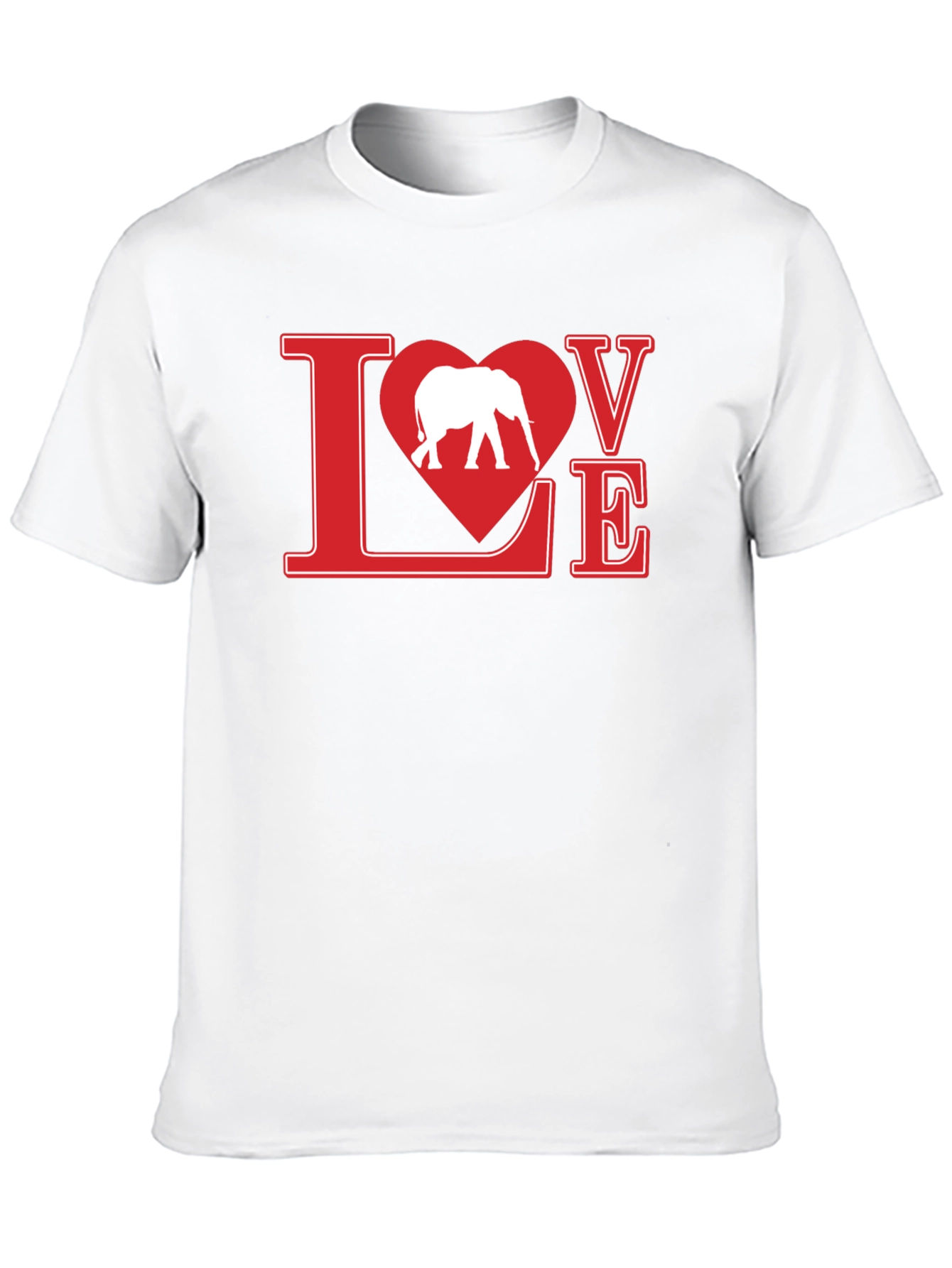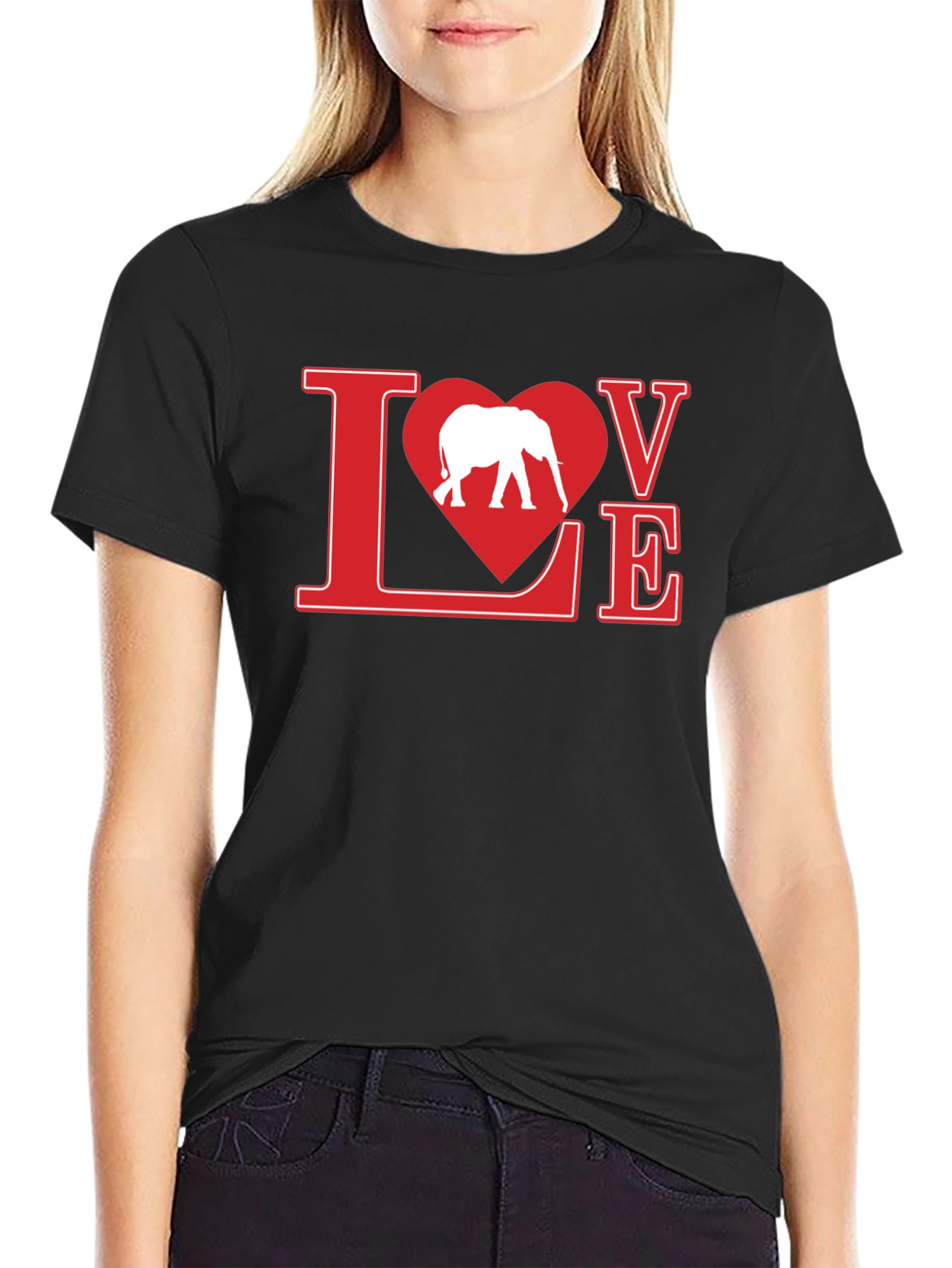 Show your love for elephants with this stylish black t-shirt. The design features the word 'LOVE' with a heart containing a white elephant silhouette. Made from soft, breathable fabric, this t-shirt offers a comfortable fit. Ideal for casual wear, animal lovers, or anyone looking to make a statement. The bold graphic print is sure to catch eyes and spark conversations. This tee is perfect for everyday wear, wildlife events, or as a thoughtful gift for elephant enthusiasts. Express your passion with this unique and eye-catching t-shirt!