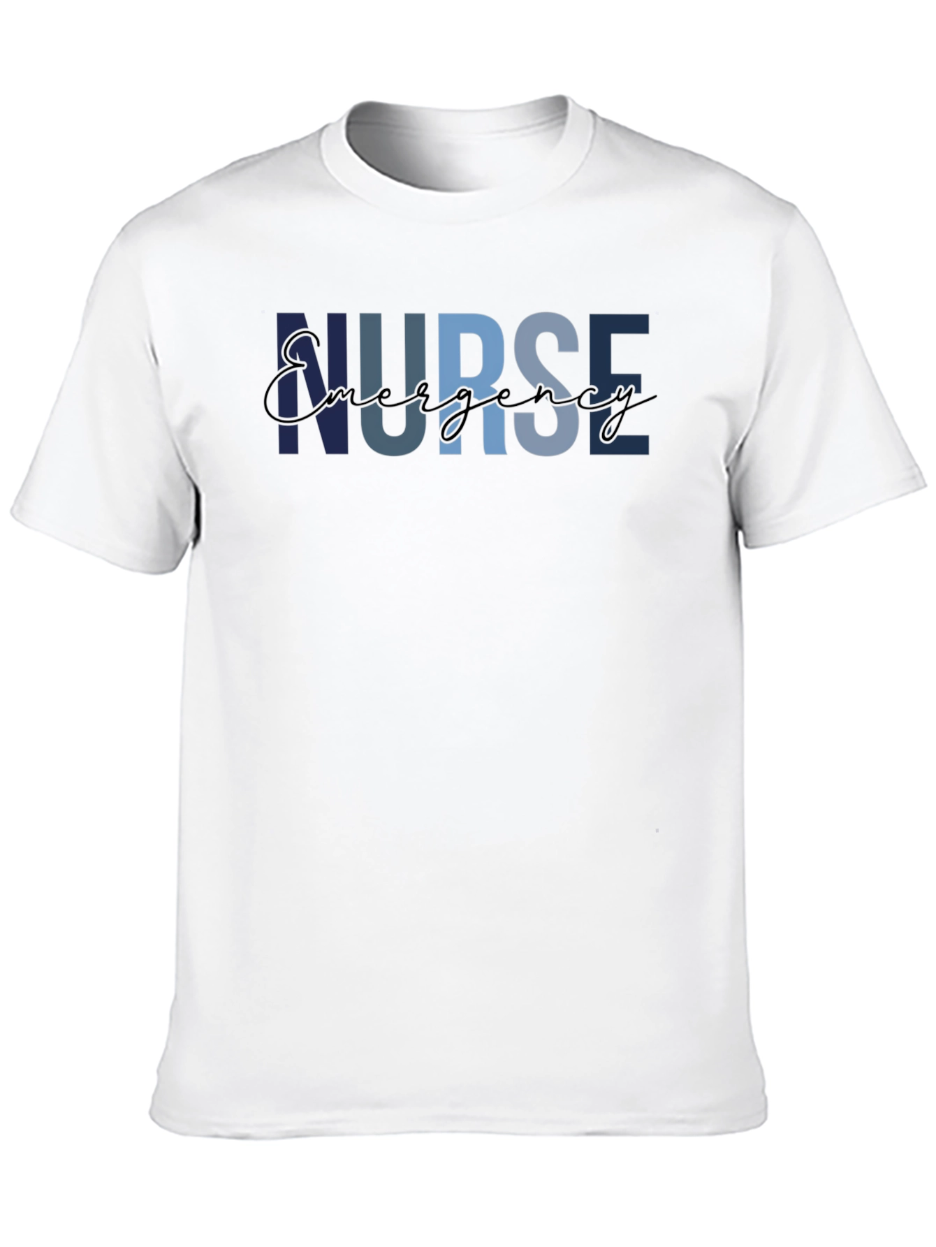 Showcase your dedication with this Emergency Nurse T-shirt. The design features the word "NURSE" in a gradient of blue shades, elegantly overlayed with the script word "Emergency." The shirt is crafted from a soft, comfortable fabric, ensuring all-day wearability. The classic crew neck and short sleeves offer a relaxed fit suitable for both men and women in the medical field. Ideal for wearing at work, casual outings, or as a thoughtful gift for the healthcare hero in your life. Wear your passion with pride in this stylish and meaningful T-shirt.