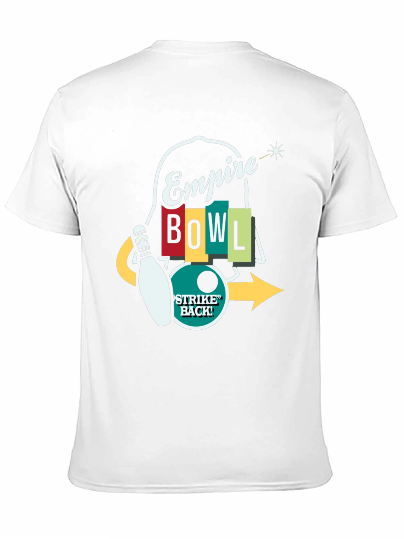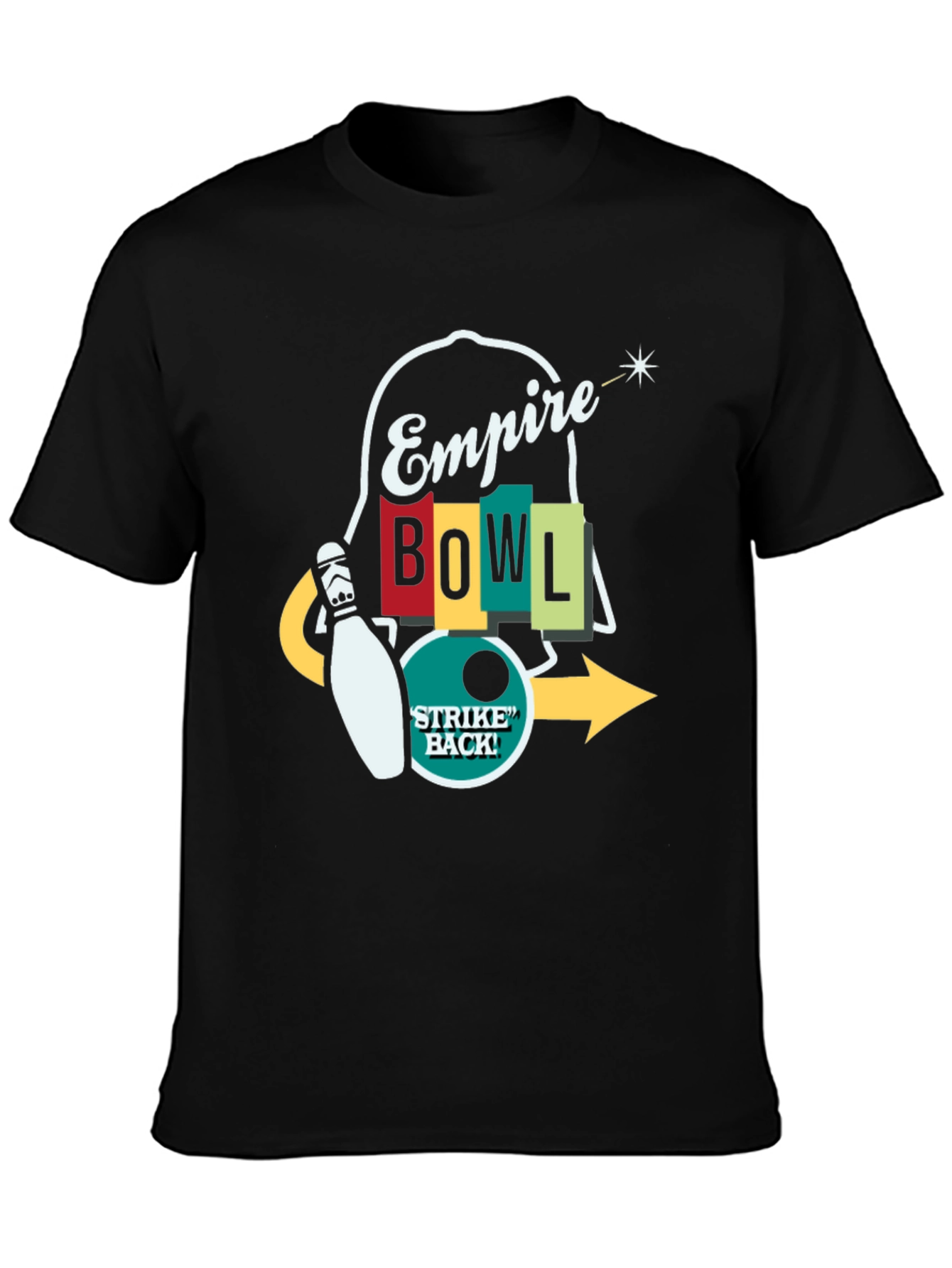 Show off your love for bowling and iconic movies with this unique "Empire Bowl Strike Back" t-shirt! This stylish black tee features a creative graphic that combines a bowling theme with a popular movie franchise. The design includes a bowling pin, a bowling ball with "Strike Back!" text, and "Empire Bowl" displayed in colorful, retro-style blocks. An arrow adds a dynamic touch, suggesting action and fun. Made from comfortable, breathable fabric, this t-shirt is perfect for casual wear, bowling nights, or as a conversation starter. Get ready to strike up some fun!