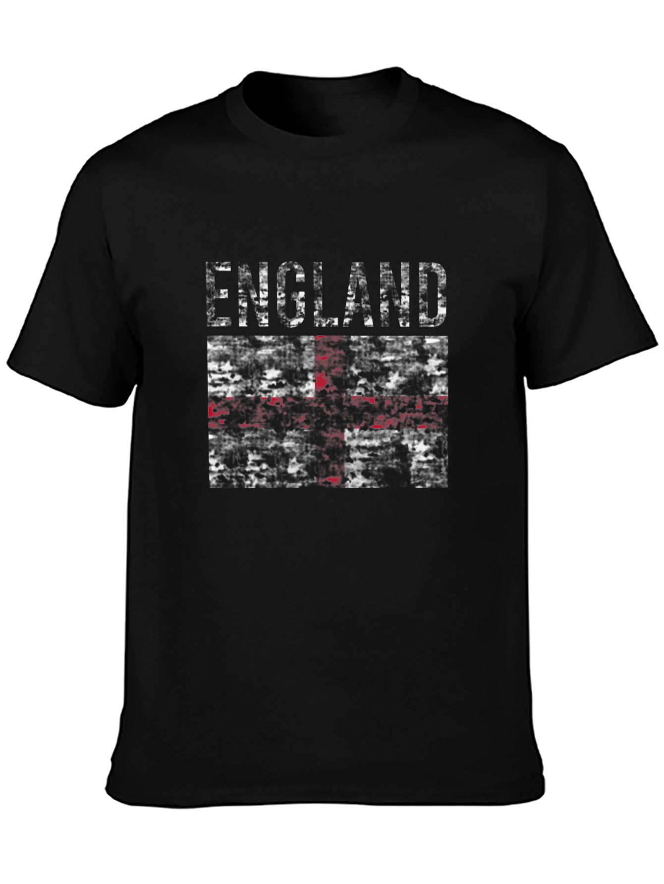 Show your English pride with this bold graphic tee. This black t-shirt features a distressed print of the England flag with the word "ENGLAND" emblazoned across the top. The vintage effect gives it a cool, worn-in look. Made from soft, breathable fabric, this tee is comfortable enough for everyday wear. Perfect for sporting events, casual outings, or simply showing off your heritage. Pair it with jeans or shorts for a relaxed yet stylish ensemble. Get yours today and represent England in style!