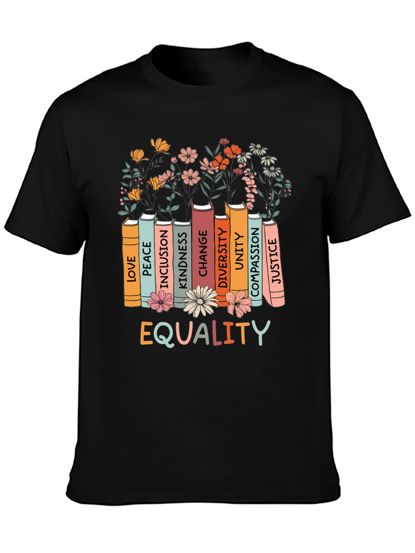 Show your support for equality with this eye-catching black t-shirt. It features a unique design of stacked books, each representing values like Love, Peace, Inclusion, Kindness, Change, Diversity, Unity, Compassion, and Justice. Blooming flowers accent the books, adding a touch of beauty to the meaningful message. The word 'EQUALITY' is displayed prominently below the books in a colorful, retro-inspired font. Made from a soft, comfortable fabric, this t-shirt is perfect for everyday wear. It's a great way to make a statement and spread a message of unity and acceptance. Wear it to rallies, events, or simply as a stylish reminder of the importance of equality.