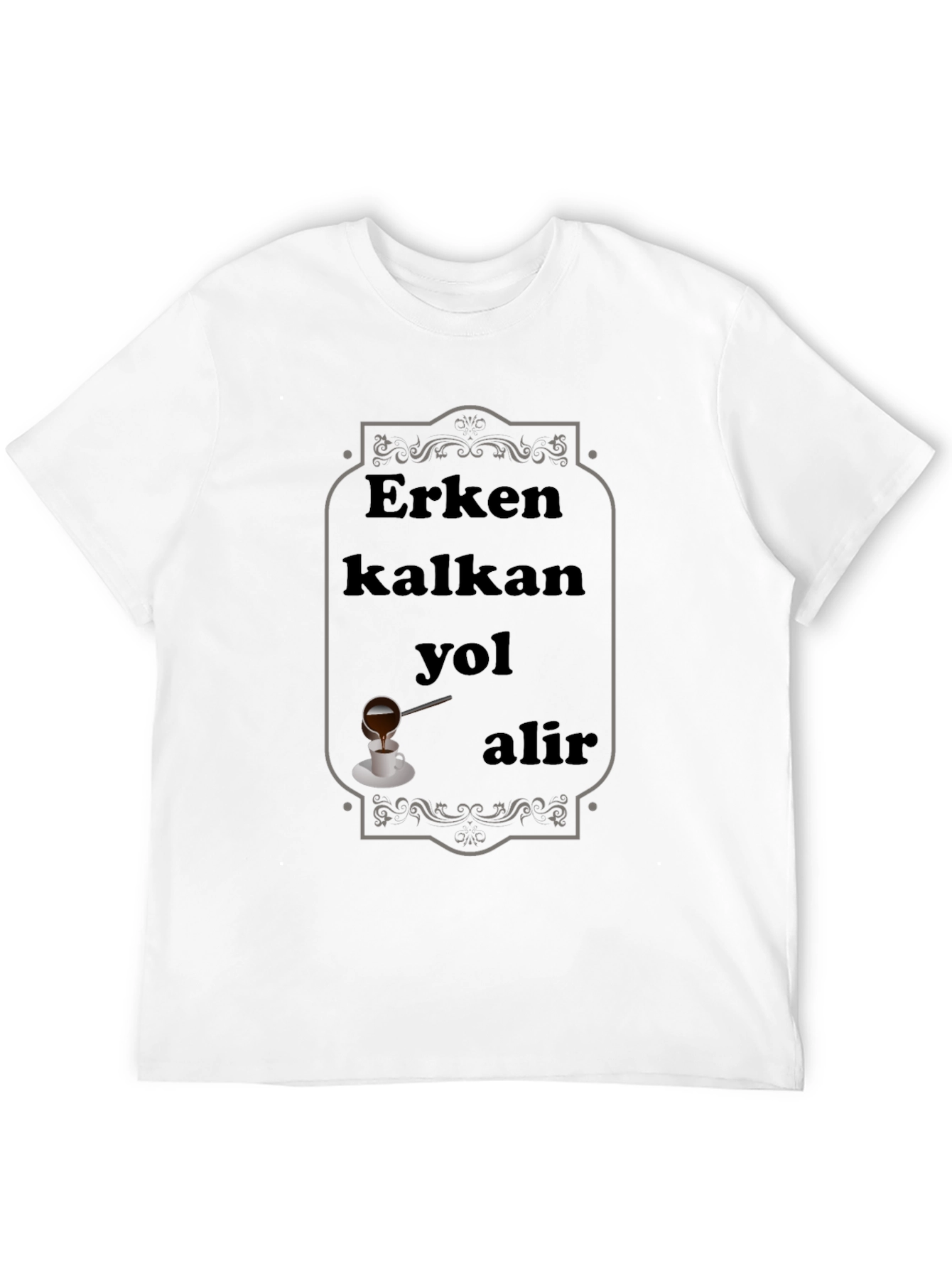Show off your unique style with this eye-catching black t-shirt. The design features a decorative framed graphic with the Turkish proverb "Erken kalkan yol alir," meaning "The early bird catches the worm." A charming illustration of a cup of Turkish coffee enhances the proverb's message. This classic fit tee is perfect for casual wear, making a statement, or as a gift for coffee lovers and language enthusiasts. This shirt is sure to turn heads and spark conversation.