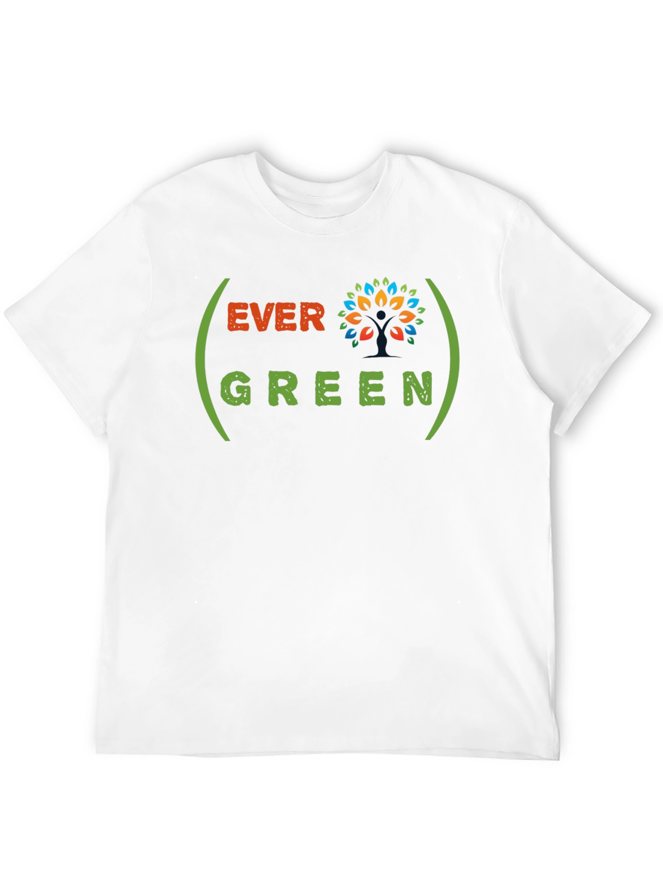 This trendy black t-shirt features a vibrant "EVERGREEN" graphic print. The design incorporates a colorful tree icon alongside the text, framed by green parenthesis. The shirt appears to be made of soft, comfortable cotton material. Its casual style makes it suitable for everyday wear. Showcase your love for nature and sustainability with this unique and eye-catching piece. Pair it with jeans, shorts, or any casual bottoms for a relaxed and stylish look. A perfect addition to any wardrobe for those who appreciate nature-inspired fashion!