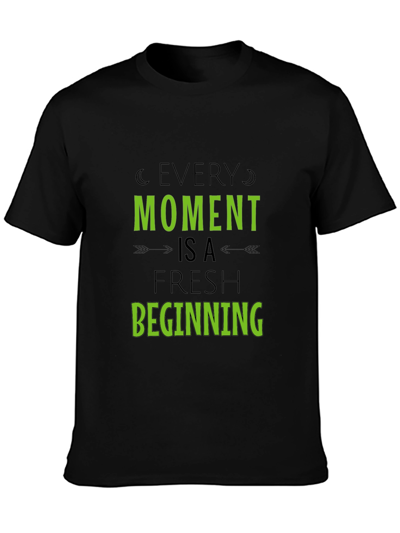 Embrace new beginnings with this stylish black t-shirt. The design features a motivational message in green font, "Every Moment is a Fresh Beginning". Made from comfortable fabric, this tee offers a relaxed fit for everyday wear. The design also features moon and arrow accents. Perfect for casual outings, gym sessions, or as a thoughtful gift for someone who appreciates inspirational messages. Step out in style and spread positivity with this trendy and meaningful tee. A great addition to any wardrobe.