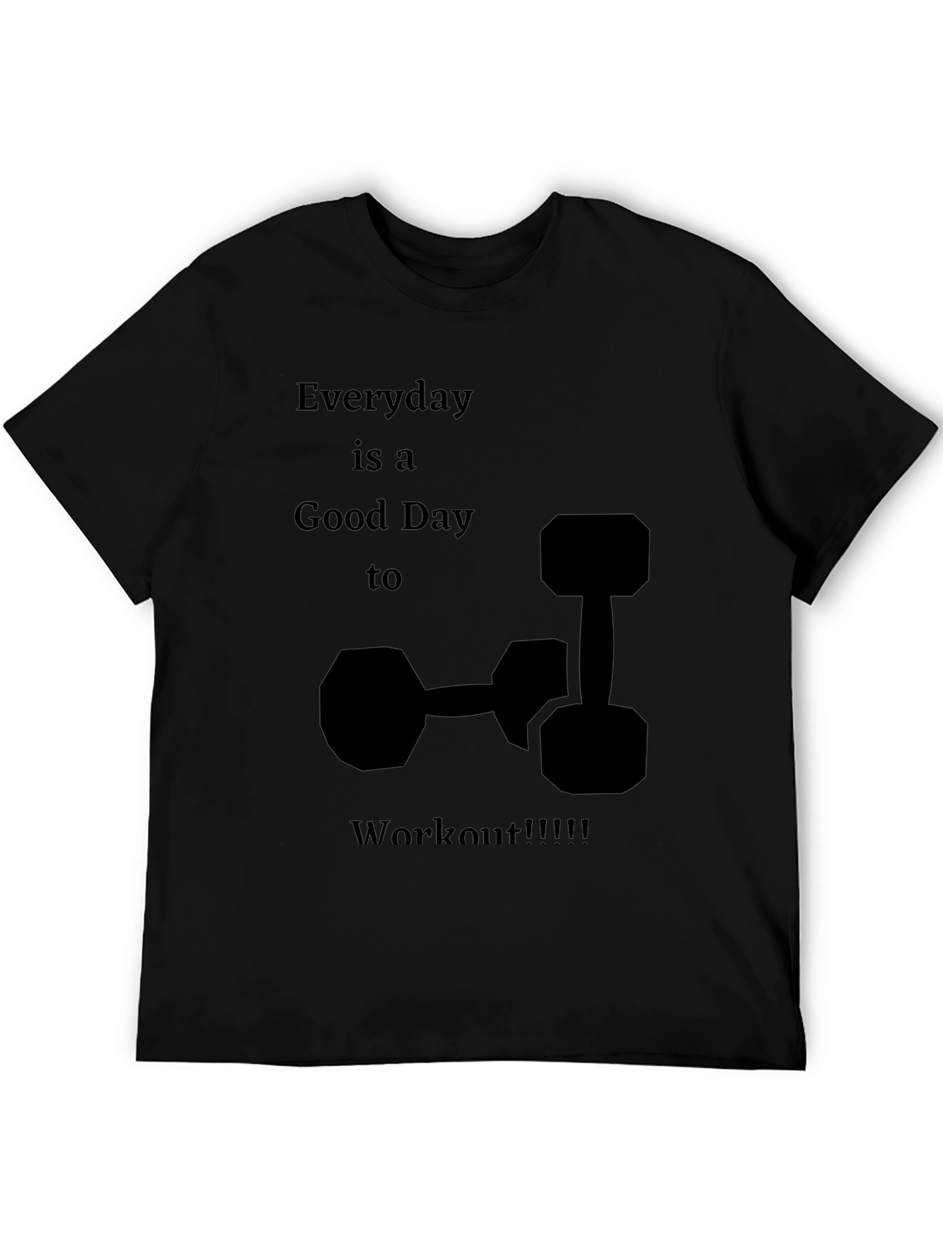 This bold black t-shirt is perfect for fitness enthusiasts. It features the motivational message "Everyday is a Good Day to Workout!!!!!" alongside a dumbbell graphic. The shirt appears to be made of a comfortable, breathable fabric, ideal for workouts or casual wear. Its classic fit and eye-catching design make it a stylish addition to any wardrobe. Show off your dedication to fitness with this unique and inspiring t-shirt. Great for the gym, outdoor activities, or simply lounging around. Get yours today and make every day a workout day!