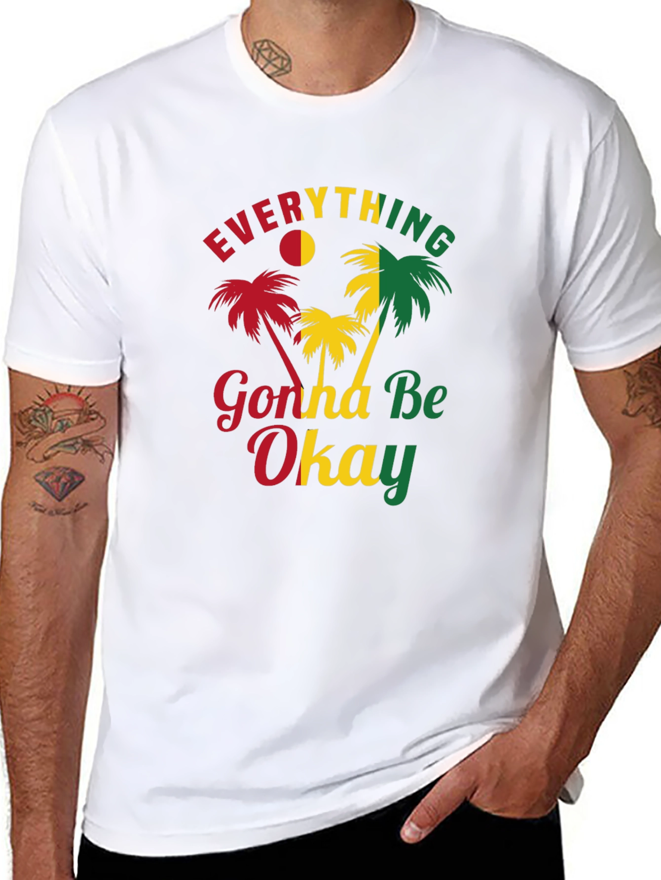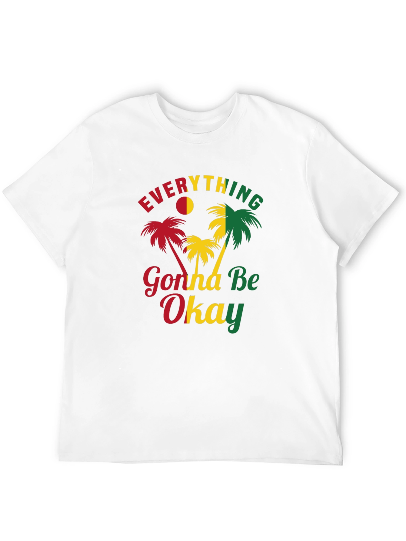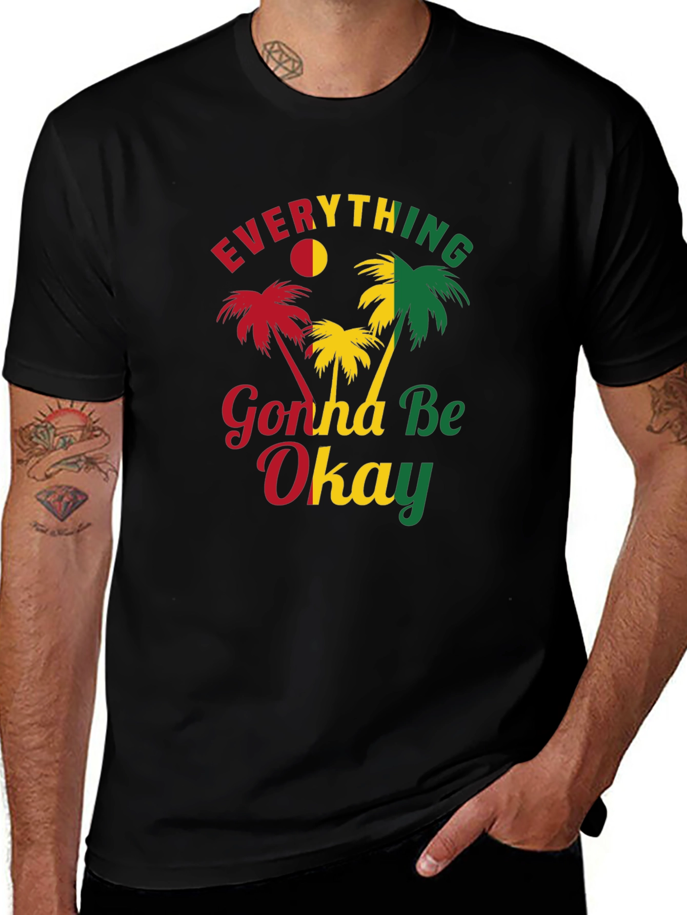 Showcase a relaxed vibe with this black graphic t-shirt. The tee features the vibrant phrase 'Everything Gonna Be Okay,' in reggae-inspired colors, complemented by palm tree graphics. Ideal for casual outings, beach trips, or simply adding a touch of positivity to your everyday style. This comfortable tee is perfect for those who appreciate laid-back fashion with an optimistic message. Wear it with jeans, shorts, or your favorite casual bottoms for a complete, stylish look. It is suitable for any casual event where you want to express a cheerful and relaxed mood.