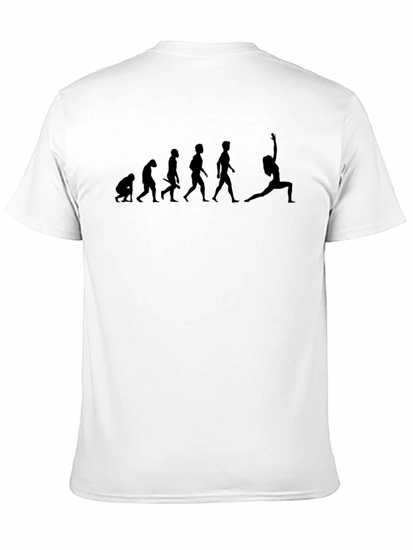 Showcase your love for yoga with this unique black t-shirt. The design features a visual representation of evolution, culminating in a figure performing a yoga pose. Made from a comfortable-looking fabric, this tee is perfect for casual wear, yoga class, or lounging at home. The design is bold and unique, making it a great conversation starter and a fantastic way to express your interests. This t-shirt offers both style and comfort. A fun and quirky addition to any yoga enthusiast's wardrobe.