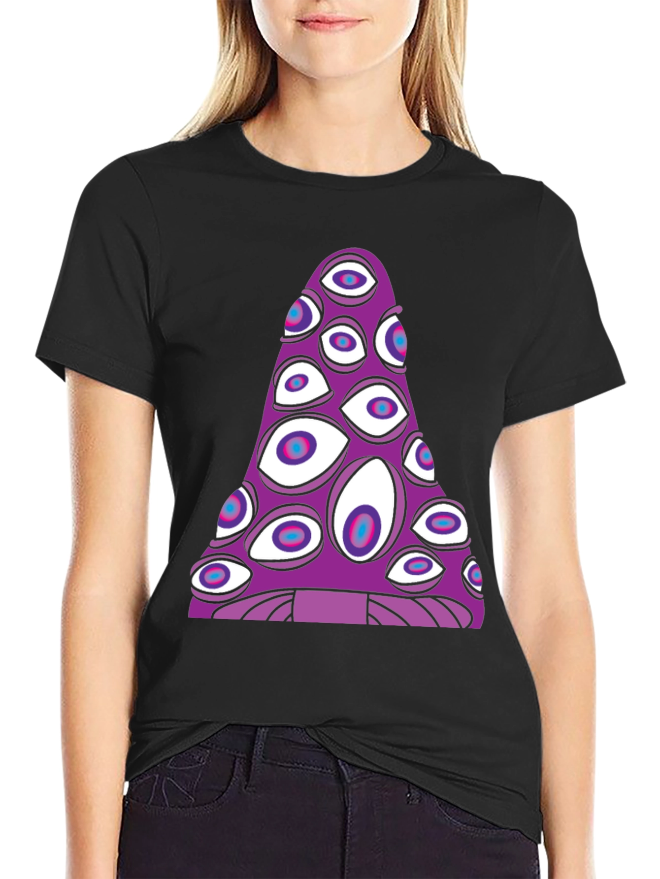 Make a statement with this unique black tee featuring a vibrant, eye-covered mushroom design. The purple mushroom, outlined in black, is covered with striking white eyes each containing a blue and purple iris. The crisp graphic stands out against the classic black cotton fabric. This tee is perfect for casual wear, concerts, or expressing your individual style. A comfortable and durable addition to any wardrobe, this t-shirt is sure to turn heads and spark conversation wherever you go. Get yours today and show off your fun and edgy fashion sense!